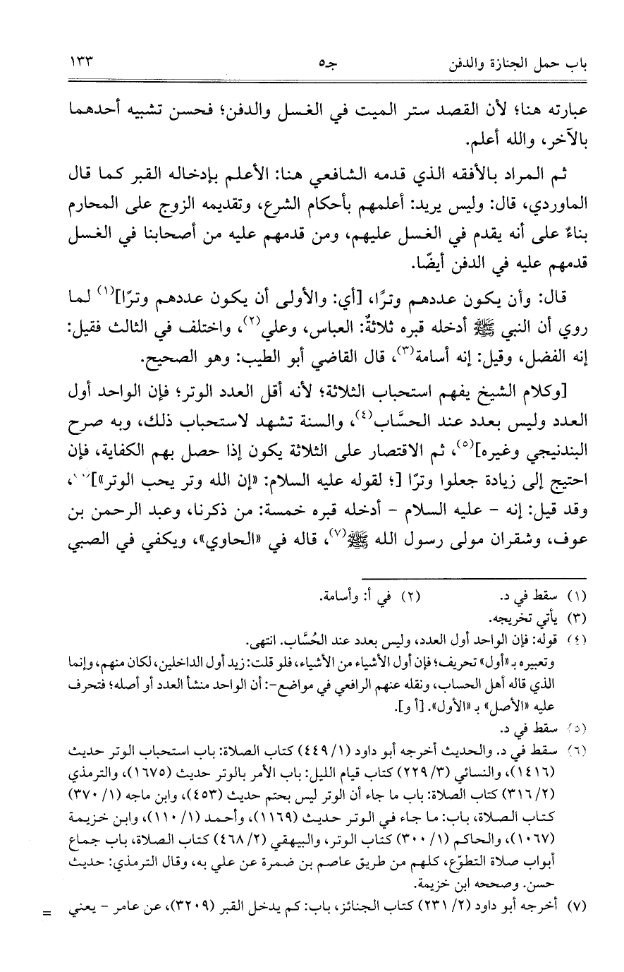 قال: وأن يكون عددهم وتراً، [أي: والأولى أن يكون عددهم وتراً] لما روي أن النبي - صلى الله عليه وسلم - أدخله قبره ثلاثة: العباس، وعلي واختلف في الثالث فقيل: إنه الفضل، وقيل: إنه أسامة، قال القاضي أبو الطيب: وهو الصحيح.
