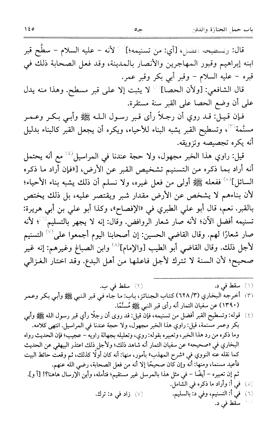 قال: وتسطيحه أفضل، [أي: من تسنيمه] لأنه – عليه السلام- سطح قبر ابنه إبراهيم وقبور المهاجرين والأنصار بالمدينة، وقد فعل الصحابة ذلك في قبره- عليه السلام- وقبر أبي بكر وقبر عمر.