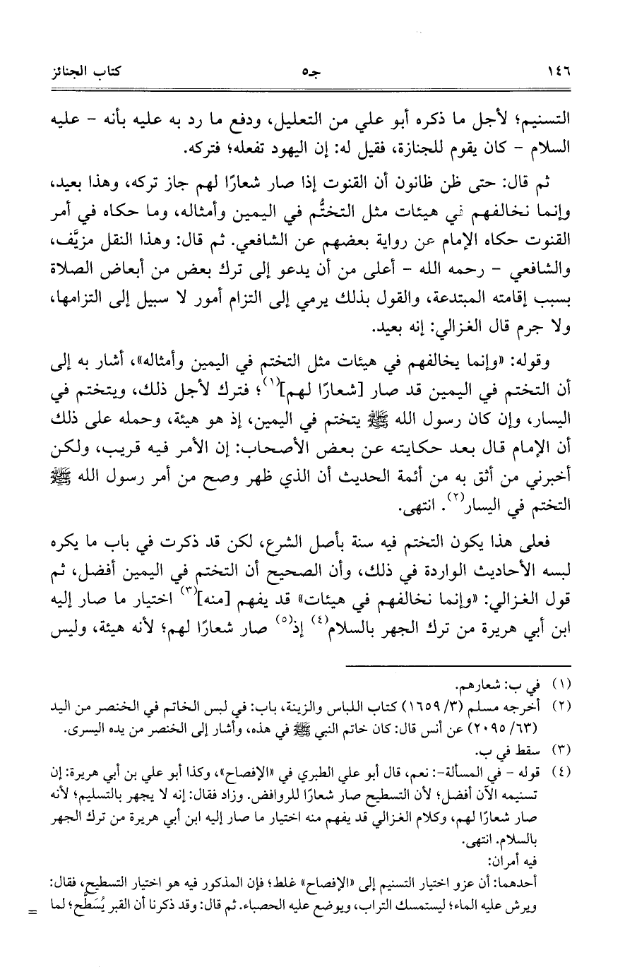 التسنيم؛ لأجل ما ذكره أبو علي من التعليل، ودفع ما رد به عليه بأنه- عليه السلام- كان يقوم للجنازة، فقيل له: إن اليهود تفعله؛ فتركه.