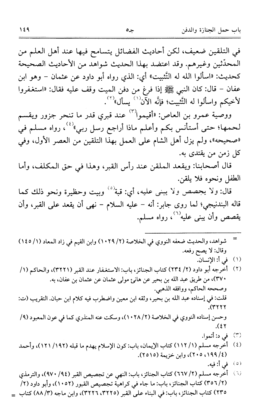 ووصية عمرو بن العاص: "أقيموا عند قبري قدر ما تنحر جزور ويقسم لحمها؛ حتى استأنس بكم وأعلم ماذا أراجع رسل ربي، رواه مسلم في "صحيحه"، ولم يزل أهل الشام على العمل بهذا التلقين من العصر الأول، وفي كل زمن من يقتدي به.