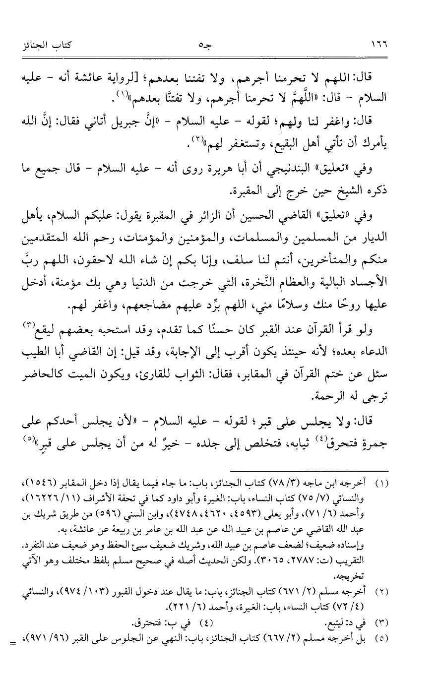 قال: اللهم لا تحرمنا أجرهم، ولا تفتنا بعدهم؛ [لرواية عائشة أنه- عليه السلام- قال: "اللَّهمَّ لا تحرمنا أجرهم، ولا تفتنَّا بعدهم".