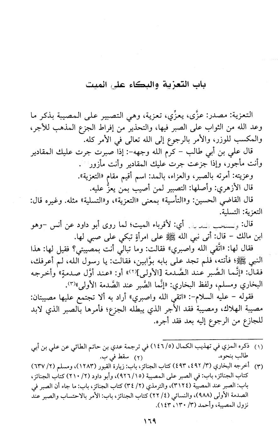 قال: وتستحب التعزية، أي: لأقرباء الميت؛ لما روى أبو داود عن أنس- وهو ابن مالك- قال: أتى نبي الله - صلى الله عليه وسلم - على امرأة تبكي على صبي لها.
