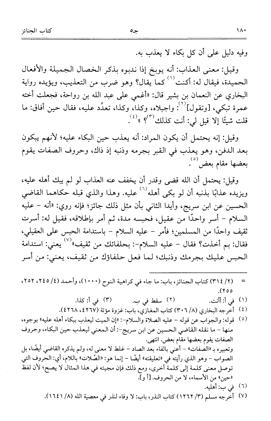 وقيل: معنى العذاب: أنه يوبخ إذا ندبوه بذكر الخصال الجميلة والأفعال الحميدة، فيقال له: أكنت كما يقال؟ وهو ضرب من التعذيب، ويؤيده رواية البخاري عن النعمان بن بشير قال: "أغمي على عبد الله بن رواحة، فجعلت أخته عمرة تبكي، [وتقول]: واجبلاه، وكذا، وكذا، تعدِّد عليه، فقال حين أفاق: ما قلت شيئاً إلا قيل لي: أنت كذلك؟
