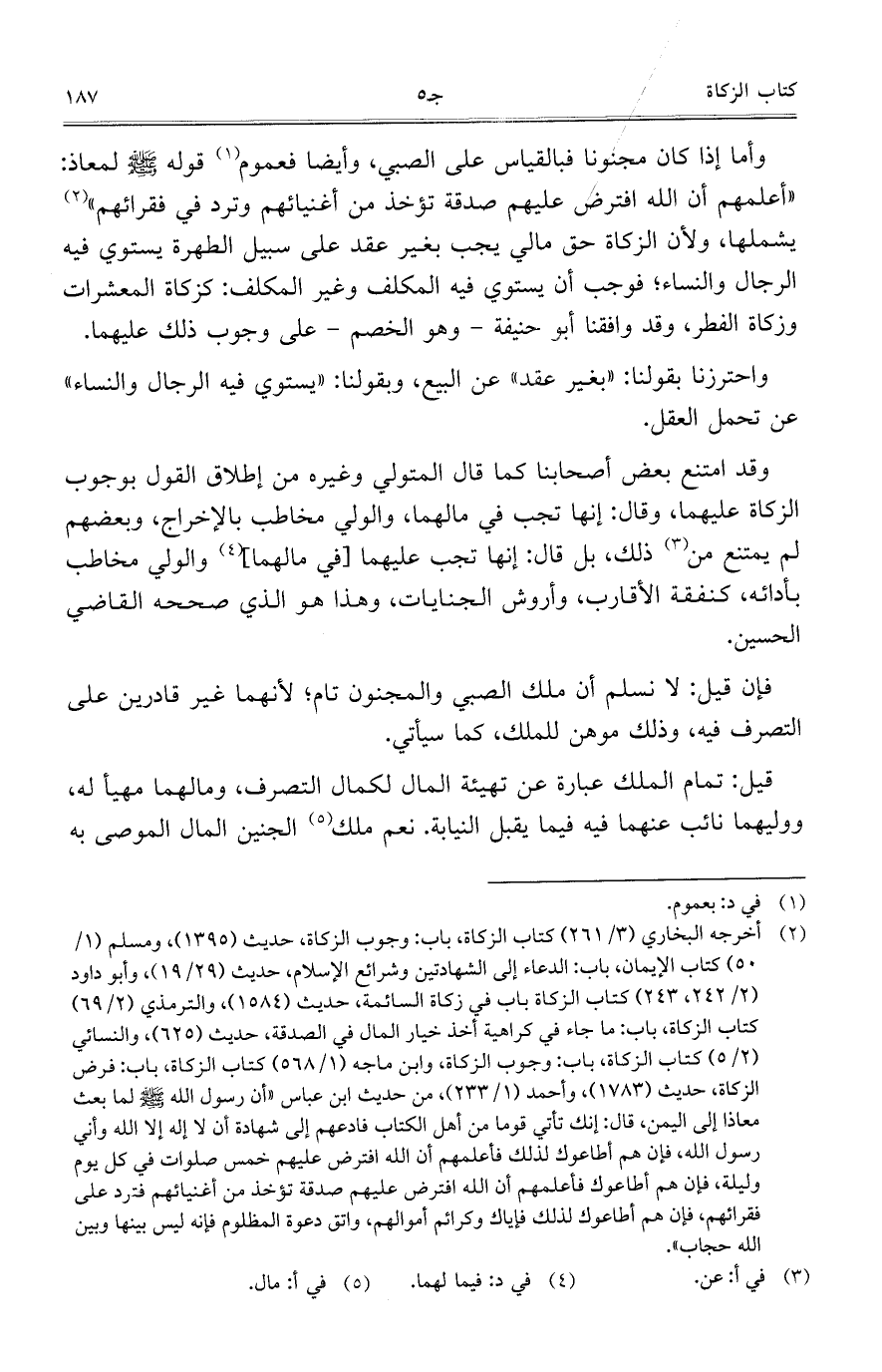 وأما إذا كان مجنونا فبالقياس على الصبي، وأيضاً فعموم قوله - صلى الله عليه وسلم - لمعاذ: "أعلمهم أن الله افترض عليهم صدقة تؤخذ من أغنيائهم وترد في فقرائهم" يشملها، ولأن الزكاة حق مالي يجب بغير عقد على سبيل الطهرة يستوي فيه الرجال والنساء؛ فوجب أن يستوي فيه المكلف وغير المكلف: كزكاة المعشرات وزكاة الفطر، وقد وافقنا أبو حنيفة- وهو الخصم- على وجوب ذلك عليهما.