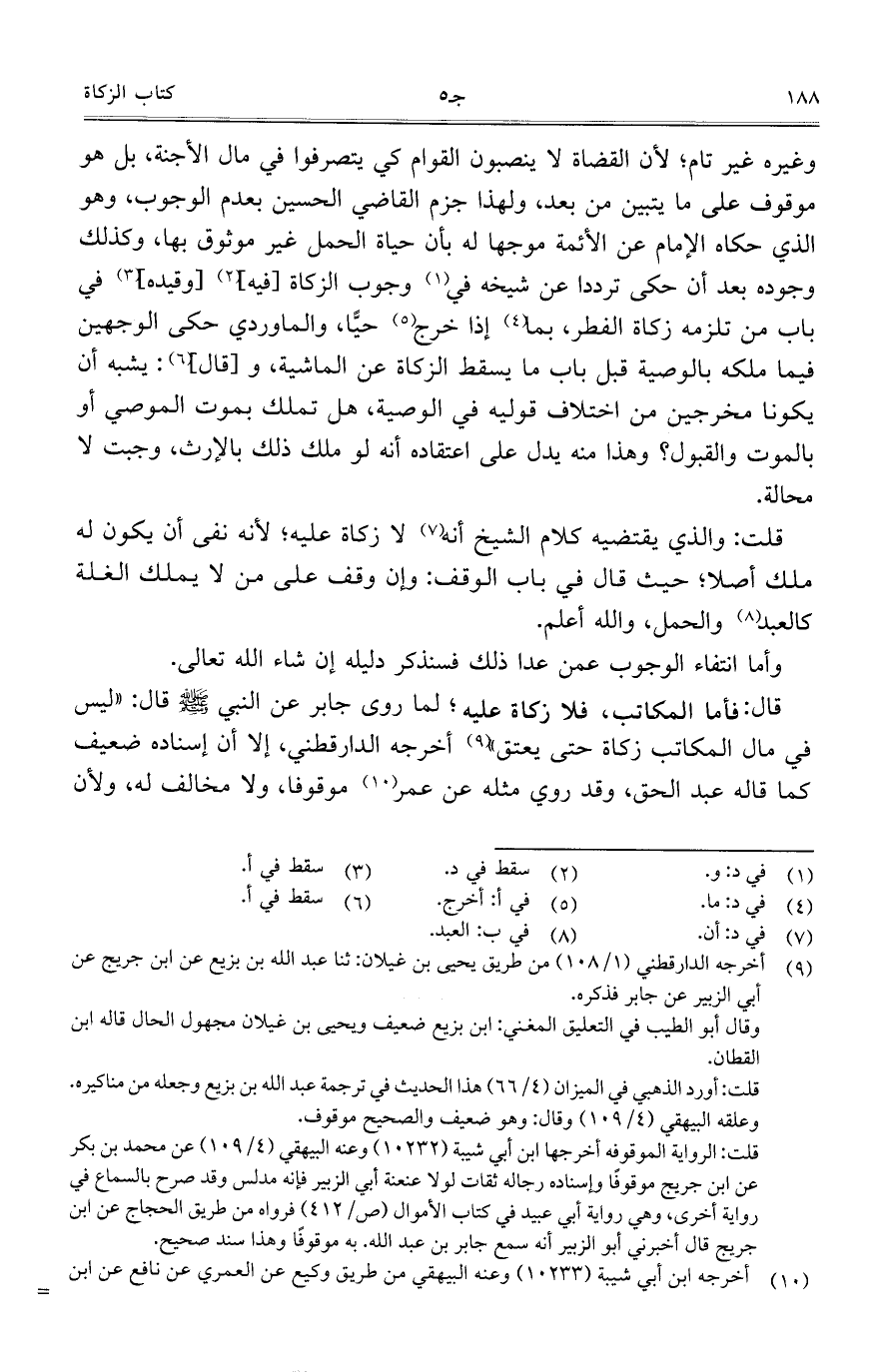 وغيره غير تام؛ لأن القضاة لا ينصبون القوام كي يتصرفوا في مال الأجنة، بل هو موقوف على ما يتبين من بعد، ولهذا جزم القاضي الحسين بعدم الوجوب، وهو الذي حكاه الإمام عن الأئمة موجهاً له بأن حياة الحمل غير موثوق بها، وكذلك وجوده بعد أن حكى تردداً عن شيخه في وجوب الزكاة [فيه] [وقيده] في باب من تلزمه زكاة الفطر، بما إذا خرج حياً، والماوردي حكى الوجهين فيما ملكه بالوصية قبل باب ما يسقط الزكاة عن الماشية، و [قال]: يشبه أن يكونا مخرجين من اختلاف قوليه في الوصية، هل تملك بموت الموصي أو بالموت والقبول؟ وهذا منه يدل على اعتقاده أنه لو ملك ذلك بالإرث، وجبت لا محالة.