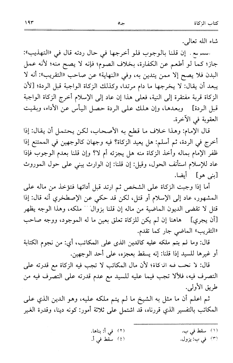 قال الإمام: وهذا خلاف ما قطع به الأصحاب، لكن يحتمل أن يقال: إذا أخرج في الردة، ثم أسلم: هل يعيد الزكاة؟ فيه وجهان كالوجهين في الممتنع إذا ظفر الإمام بماله وأخذ الزكاة منه هل يجزئه أم لا؟ وإن قلنا بعدم الوجوب فإذا عاد للإسلام استأنف الحول، وقيل: إن قلنا: إن الوارث يبني على حول الموروث [بنى هو] أيضاً.