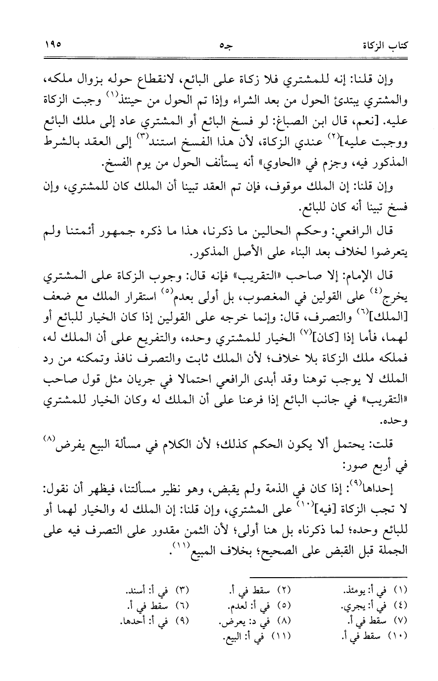 وإن قلنا: إنه للمشتري فلا زكاة على البائع، لانقطاع حوله بزوال ملكه، والمشتري يبتدئ الحول من بعد الشراء وإذا تم الحول من حينئذ وجبت الزكاة عليه. [نعم، قال ابن الصباغ: لو فسخ البائع أو المشتري عاد إلى ملك البائع ووجبت عليه] عندي الزكاة، لأن هذا الفسخ استند إلى العقد بالشرط المذكور فيه، وجزم في "الحاوي" أنه يستأنف الحول من يوم الفسخ.