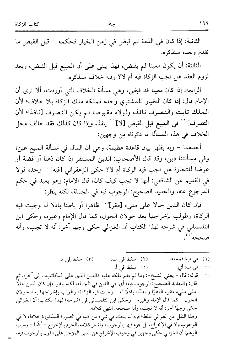 أحدهما- وبه يظهر بيان قاعدة عظيمة، وهي أن المال في مسألة المبيع عين؛ وفي مسألتنا دين، وقد قال الأصحاب: الدين المستقر إذا كان ذهبا أو فضة أو عرضا للتجارة هل تجب فيه الزكاة أم لا؟ حكى الزعفراني [فيه] وحده قولا في القديم عن الشافعي: أنها لا تجب كيف كان، قال الإمام: وهو بعيد في حكم المرجوع عنه، والجديد الصحيح: الوجوب فيه في الجملة، لكنه ينظر: