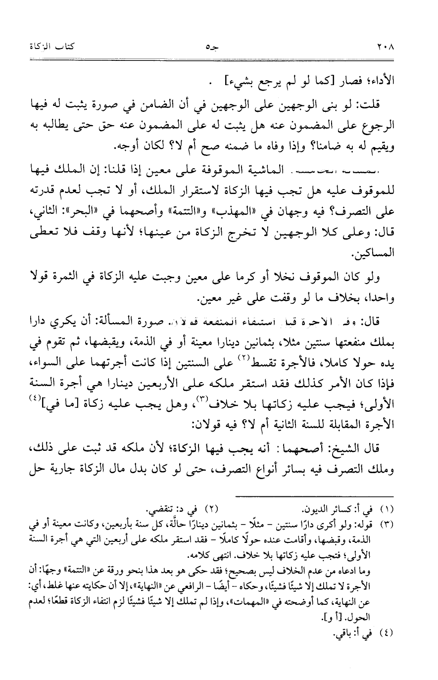 قال: وفي الآخرة قبل استيفاء المنفعة قولان. صورة المسألة: أن يكري داراً بملك منفعتها سنتين مثلاً، بثمانين ديناراً معينة أو في الذمة، ويقبضها، ثم تقوم في يده حولاً كاملاً، فالأجرة تقسط على السنتين إذا كانت أجرتهما على السواء، فإذا كان الأمر كذلك فقد استقر ملكه على الأربعين ديناراً هي أجرة السنة الأولى؛ فيجب عليه زكاتها بلا خلاف، وهل يجب عليه زكاة [ما في] الأجرة المقابلة للسنة الثانية أم لا؟ فيه قولان:
