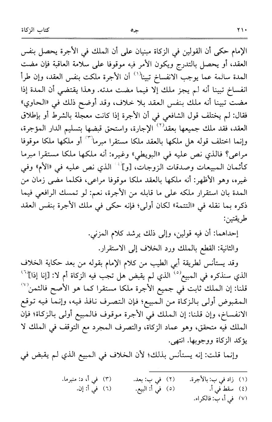 وقد يستأنس لطريقة أبي الطيب من كلام الإمام بقوله من بعد حكاية الخلاف الذي سنذكره في المبيع الذي لم يقبض هل تجب فيه الزكاة أم لا: [إنا إذا] قلنا: إن الملك ثابت في جميع الأجرة ملكاً مستقراً كما هو الأصح فالثمن المقبوض أولى بالزكاة من المبيع؛ فإن التصرف نافذ فيه، وإنما فيه توقع الانفساخ، وإن قلنا: إن الملك في الأجرة موقوف فالمبيع أولى بالزكاة؛ فإن الملك فيه محقق، وهو عماد الزكاة، والتصرف المجرد مع التوقف في الملك لا يؤكد الزكاة ووجوبها. انتهى.