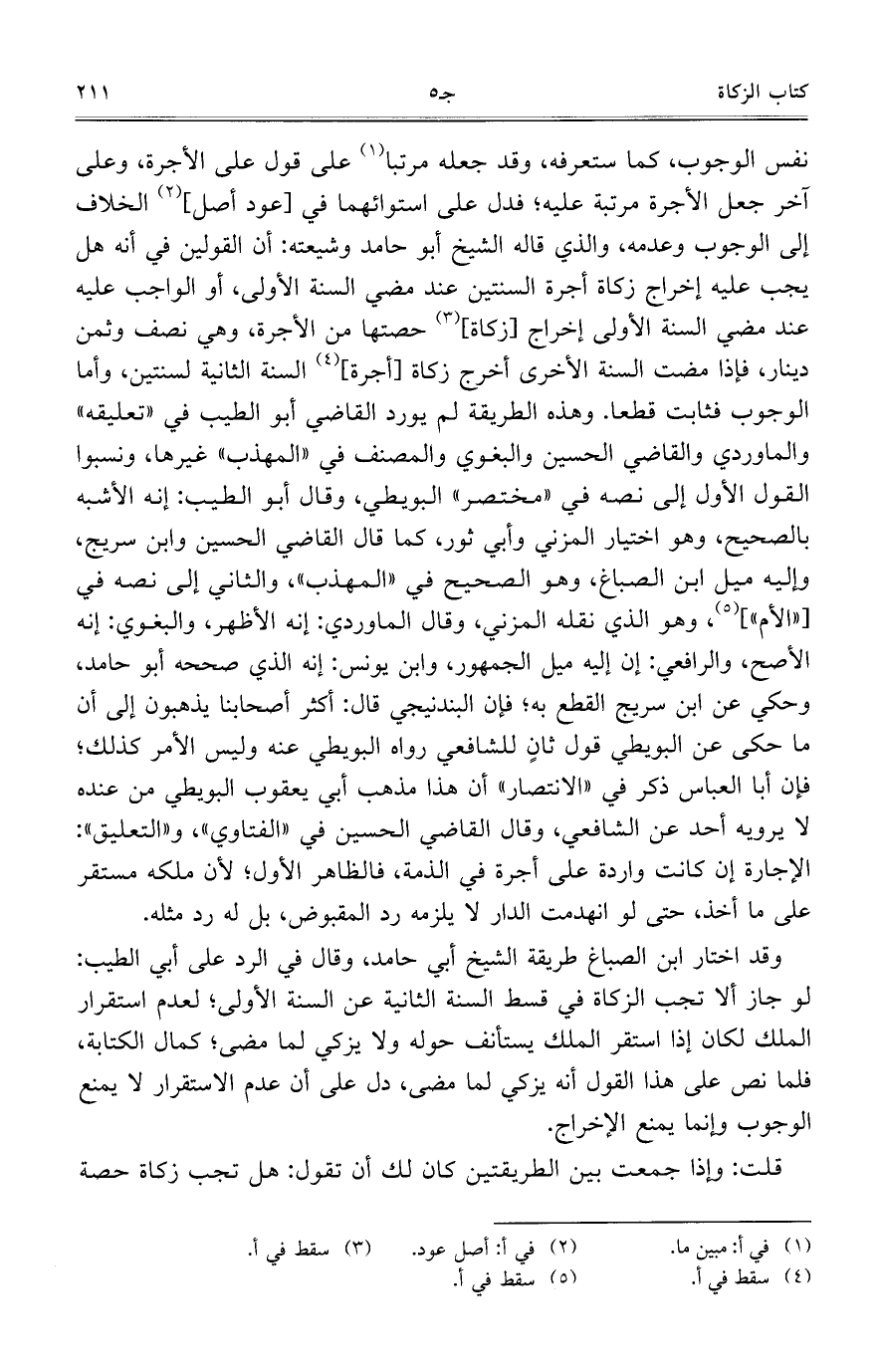 نفس الوجوب، كما ستعرفه، وقد جعله مرتباً على قول على الأجرة، وعلى آخر جعل الأجرة مرتبة عليه؛ فدل على استوائهما في [عود أصل] الخلاف إلى الوجوب وعدمه، والذي قاله الشيخ أبو حامد وشيعته: أن القولين في أنه هل يجب عليه إخراج زكاة أجرة السنتين عند مضي السنة الأولى، أو الواجب عليه عند مضي السنة الأولى إخراج [زكاة] حصتها من الأجرة، وهي نصف وثمن دينار، فإذا مضت السنة الأخرى أخرج زكاة [أجرة] السنة الثانية لسنتين، وأما الوجوب فثابت قطعا. وهذه الطريقة لم يورد القاضي أبو الطيب في "تعليقه" والماوردي والقاضي الحسين والبغوي والمصنف في "المهذب" غيرها، ونسبوا القول الأول إلى نصه في "مختصر" البويطي، وقال أبو الطيب: إنه الأشبه بالصحيح، وهو اختيار المزني وأبي ثور، كما قال القاضي الحسين وابن سريج، وإليه ميل ابن الصباغ، وهو الصحيح في "المهذب"، والثاني إلى نصه في ["الأم"]، وهو الذي نقله المزني، وقال الماوردي: إنه الأظهر، والبغوي: إنه الأصح، والرافعي: إن إليه ميل الجمهور، وابن يونس: إنه الذي صححه أبو حامد، وحكي عن ابن سريج القطع به؛ فإن البندنيجي قال: أكثر أصحابنا يذهبون إلى أن ما حكى عن البويطي قول ثانٍ للشافعي رواه البويطي عنه وليس الأمر كذلك؛ فإن أبا العباس ذكر في "الانتصار" أن هذا مذهب أبي يعقوب البويطي من عنده لا يرويه أحد عن الشافعي، وقال القاضي الحسين في "الفتاوى"، و"التعليق": الإجارة إن كانت واردة على أجرة في الذمة، فالظاهر الأول؛ لأن ملكه مستقر على ما أخذ، حتى لو انهدمت الدار لا يلزمه رد المقبوض، بل له رد مثله.