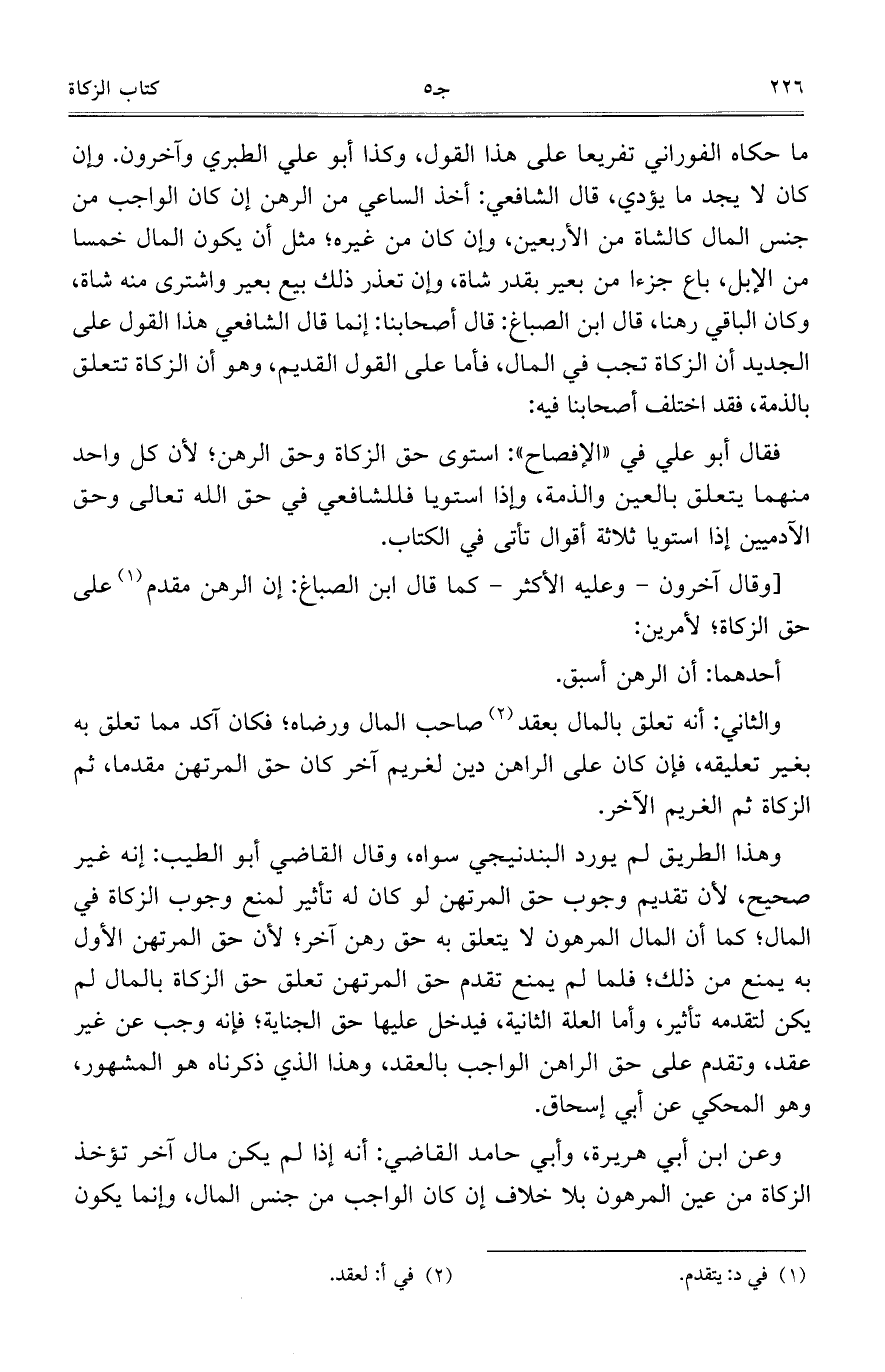 [وقال آخرون -وعليه الأكثر - كما قال ابن الصباغ: إن الرهن مقدم على حق الزكاة؛ لأمرين: