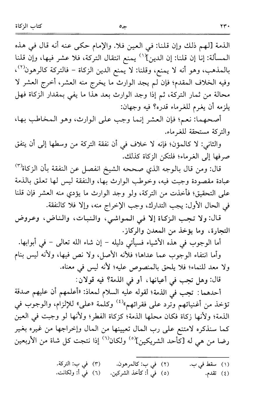 الذمة [لهم ذلك وإن قلنا: في العين فلا. والإمام حكى عنه أنه قال في هذه المسألة: إنا إن قلنا: إن الدين] يمنع انتقال التركة، فلا عشر فيها، وإن قلنا بالمذهب، وهو أنه لا يمنع، وقلنا: لا يمنع الدين الزكاة- فالتركة كالرهون، وفيه الخلاف المقدم؛ فإن لم يجد الوارث ما يخرج منه العشر، أخرج العشر لا محالة من ثمار التركة، ثم إذا وجد الوارث بعد هذا ما يفي بمقدار الزكاة فهل يلزمه أن يغرم للغرماء قدره؟ فيه وجهان: