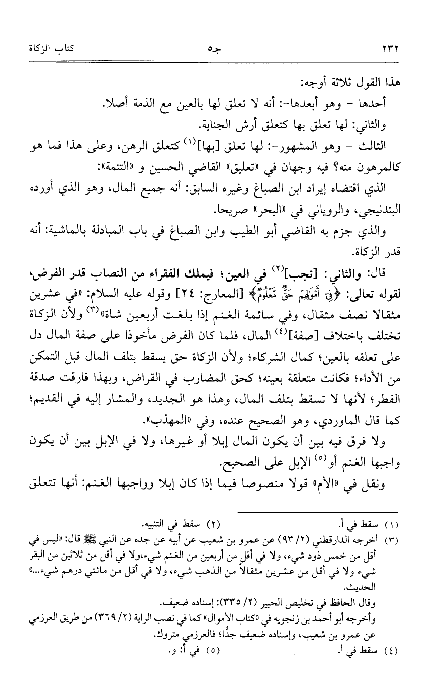 قال: والثاني: [تجب] في العين؛ فيملك الفقراء من النصاب قدر الفرض، لقوله تعالى: {فِي أَمْوَالِهِمْ حَقٌّ مَعْلُومٌ} [المعارج: 24] وقوله عليه السلام: "في عشرين مثقالاً نصف مثقال، وفي سائمة الغنم إذا بلغت أربعين شاة" ولأن الزكاة تختلف باختلاف [صفة] المال، فلما كان الفرض مأخوذاً على صفة المال دل على تعلقه بالعين؛ كمال الشركاء؛ ولأن الزكاة حق يسقط بتلف المال قبل التمكن من الأداء؛ فكانت متعلقة بعينه؛ كحق المضارب في القراض، وبهذا فارقت صدقة الفطر؛ لأنها لا تسقط بتلف المال، وهذا هو الجديد، والمشار إليه في القديم؛ كما قال الماوردي، وهو الصحيح عنده، وفي "المهذب".