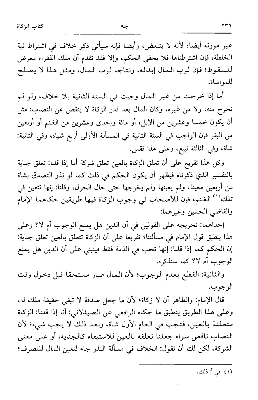 إحداهما: تخريجه على القولين في أن الدين هل يمنع الوجوب أم لا؟ وعلى هذا ينطبق قول الإمام في مسألتنا؛ تفريعاً على أن الزكاة تتعلق بالعين تعلق جناية: إن الحكم كما إذا قلنا: إنها تجب في الذمة فقط فينبني على أن الدين هل يمنع الوجوب أم لا؟ كما سنذكره.