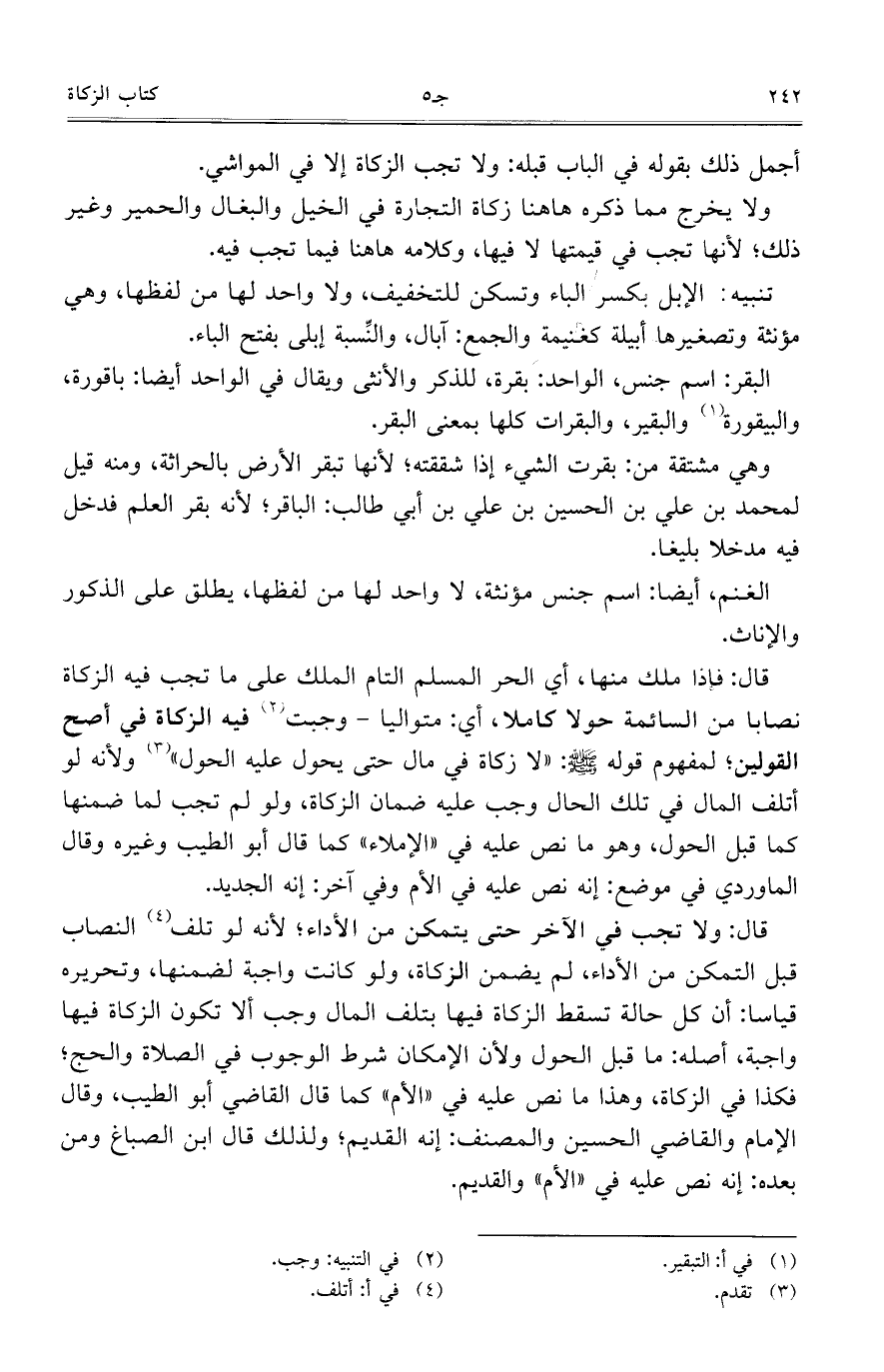 قال: فإذا ملك منها، أي الحر المسلم التام الملك على ما تجب فيه الزكاة نصاباً من السائمة حولاً كاملاً، أي: متوالياً- وجبت فيه الزكاة في أصح القولين؛ لمفهوم قوله - صلى الله عليه وسلم -: "لا زكاة في مال حتى يحول عليه الحول" ولأنه لو أتلف المال في تلك الحال وجب عليه ضمان الزكاة، ولو لم تجب لما ضمنها كما قبل الحول، وهو ما نص عليه في "الإملاء" كما قال أبو الطيب وغيره وقال الماوردي في موضع: إنه نص عليه في الأم وفي آخر: إنه الجديد.