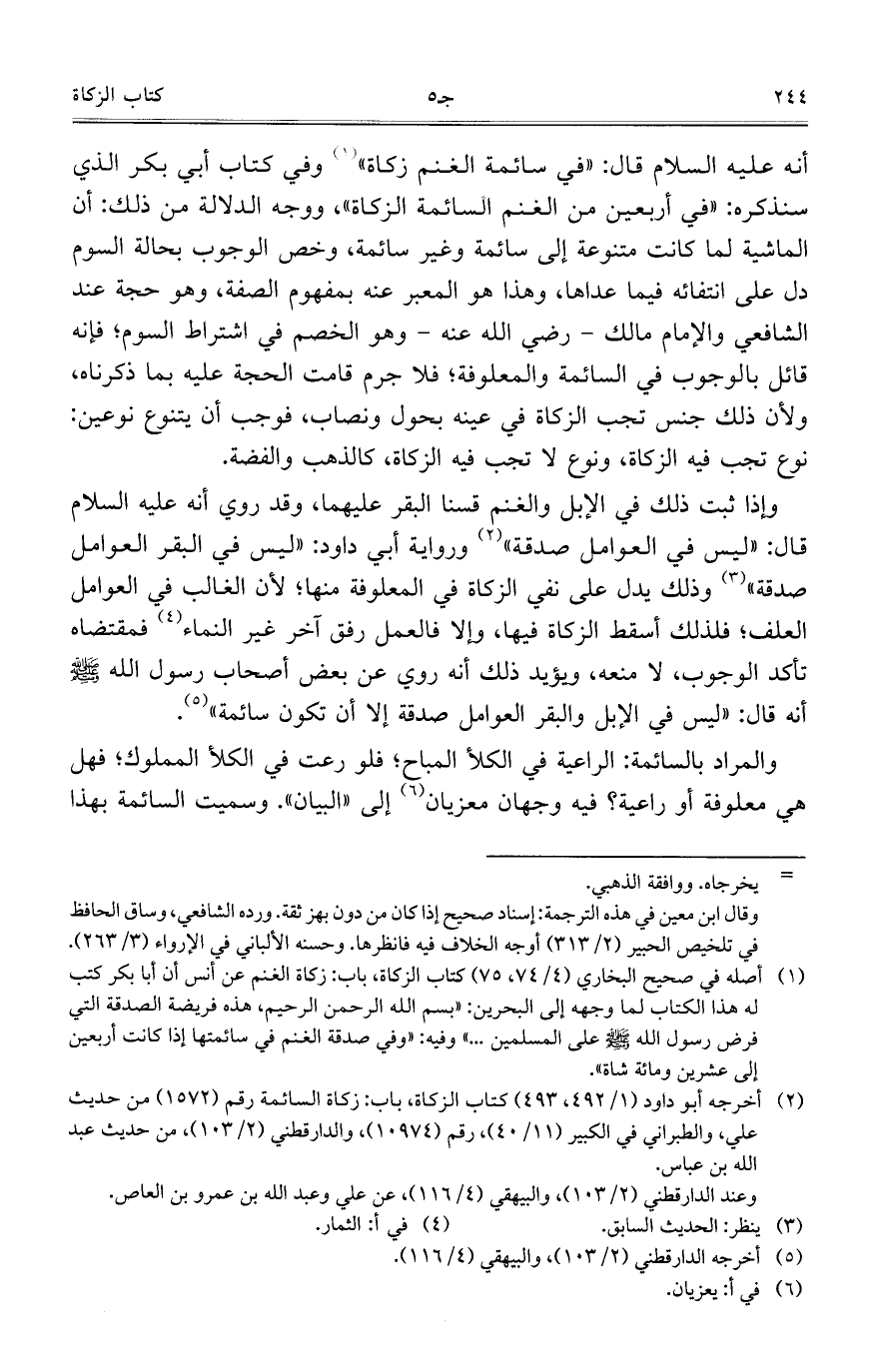 والمراد بالسائمة: الراعية في الكلأ المباح؛ فلو رعت في الكلأ المملوك؛ فهل هي معلوفة أو راعية؟ فيه وجهان معزيان إلى "البيان". وسميت السائمة بهذا
