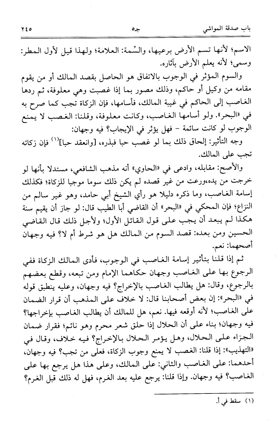 والأصح: مقابله، وادعى في "الحاوي" أنه مذهب الشافعي، مستدلاً بأنها لو خرجت من يده، ورعت من غير قصده لم يكن ذلك سوما موجباً للزكاة؛ فكذلك إسامة الغاصب، وما ذكره دليلاً هو رأي الشيخ أبي حامد، وهو غير سالم من النزاع؛ فإن المحكي في "البحر" أن القاضي أبا الطيب قال: لو جاز أن يقيم سنة هكذا لم يبعد أن يجب على قول القائل الأول؛ ولأجل ذلك قال القاضي الحسين ومن بعده: قصد السوم من المالك هل هو شرط أم لا؟ فيه وجهان أصحهما: نعم.
