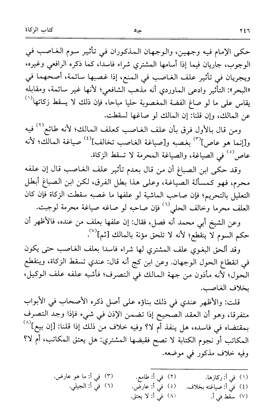 ومن قال بالأول فرق بأن علف الغاصب كعلف المالك؛ لأنه طائع فيه و [إنما هو عاص] بغصبه و [صياغة الغاصب تخالف] صياغة المالك؛ لأنه عاص في الصياغة، والصياغة المحرمة لا تسقط الزكاة.