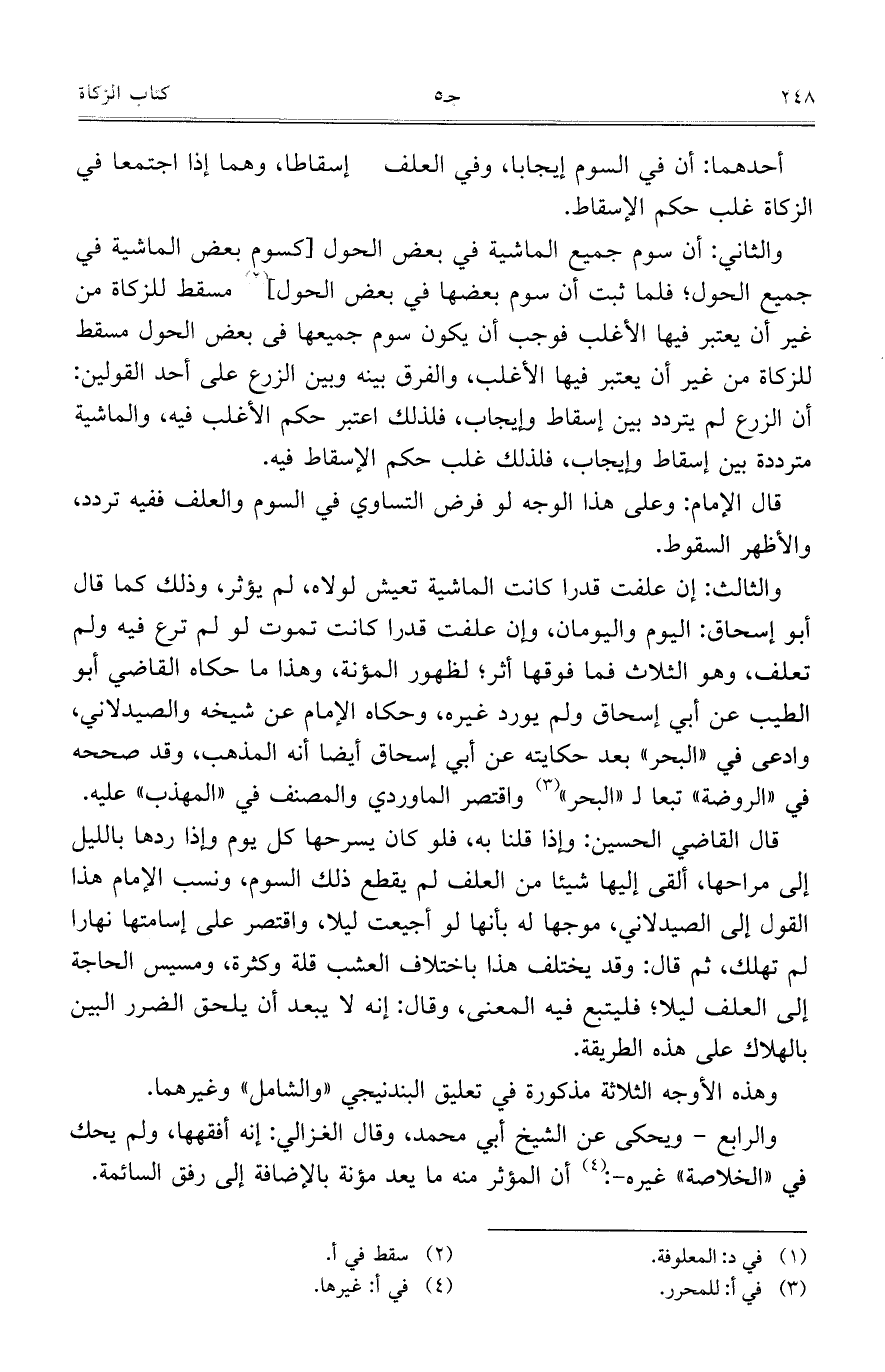 والثالث: إن علفت قدراً كانت الماشية تعيش لولاه، لم يؤثر، وذلك كما قال أبو إسحاق: اليوم واليومان، وإن علفت قدراً كانت تموت لو لم ترع فيه ولم تعلف، وهو الثلاث فما فوقها أثر؛ لظهور المؤنة، وهذا ما حكاه القاضي أبو الطيب عن أبي إسحاق ولم يورد غيره، وحكاه الإمام عن شيخه والصيدلاني، وادعى في "البحر" بعد حكايته عن أبي إسحاق أيضاً أنه المذهب، وقد صححه في "الروضة" تبعاً لـ"البحر" واقتصر الماوردي والمصنف في "المهذب" عليه.