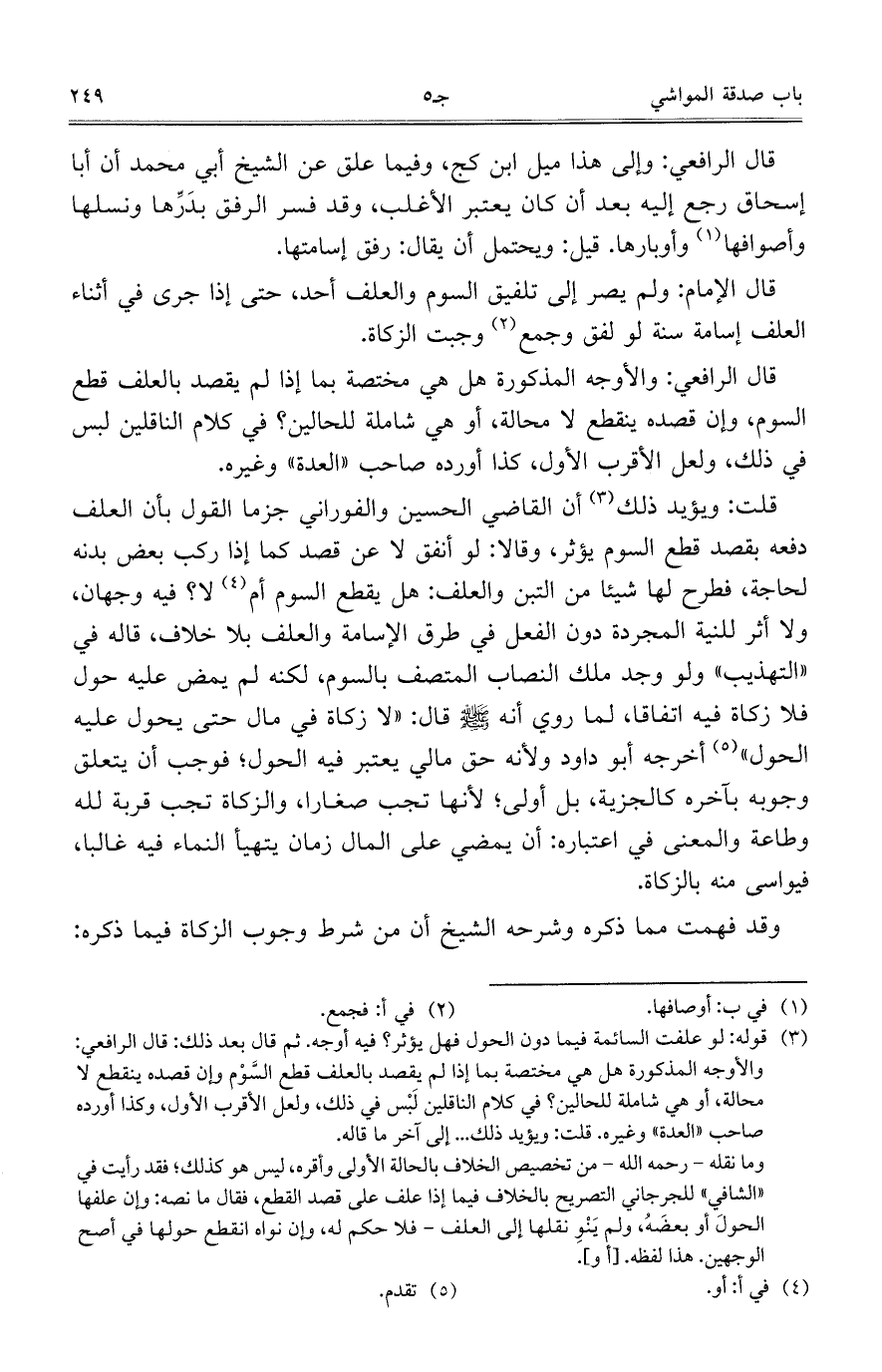 قال الرافعي: والأوجه المذكورة هل هي مختصة بما إذا لم يقصد بالعلف قطع السوم، وإن قصده ينقطع لا محالة، أو هي شاملة للحالين؟ في كلام الناقلين لبس في ذلك، ولعل الأقرب الأول، كذا أورده صاحب "العدة" وغيره.
