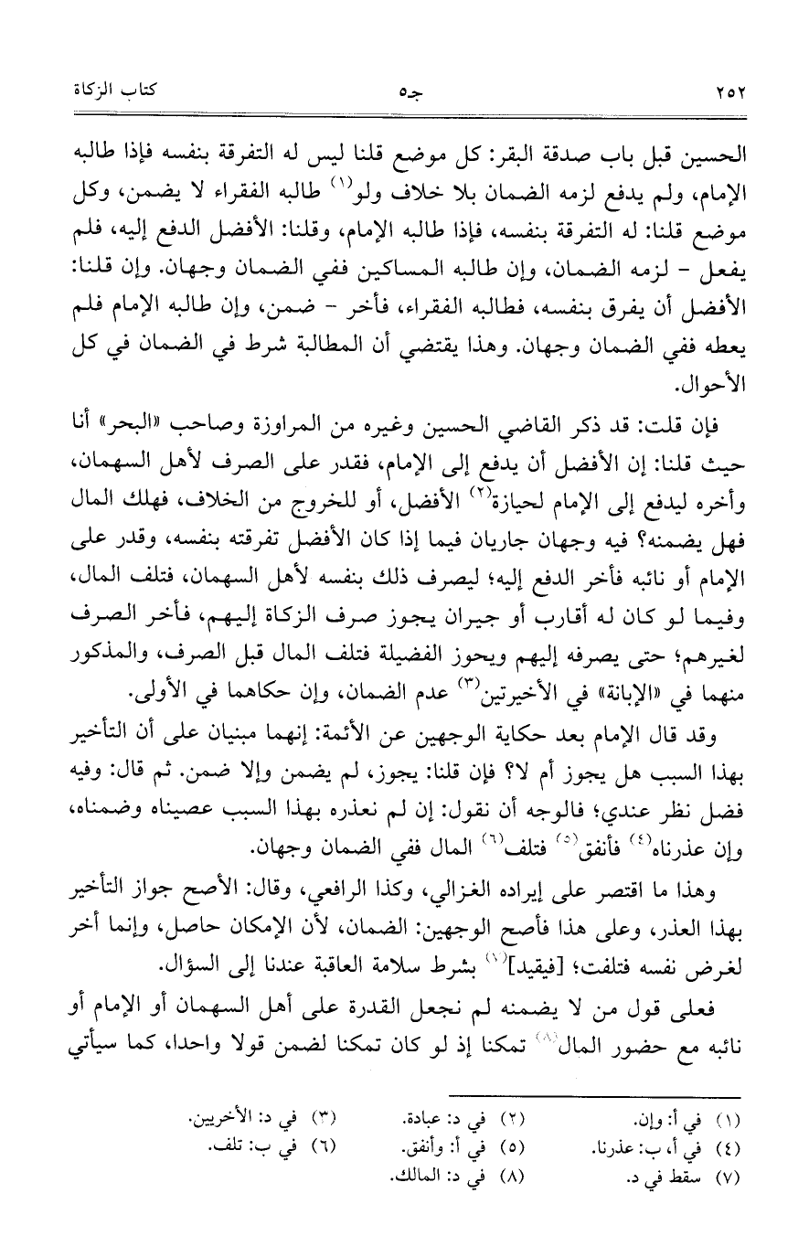 فإن قلت: قد ذكر القاضي الحسين وغيره من المراوزة وصاحب "البحر" أنا حيث قلنا: إن الأفضل أن يدفع إلى الإمام، فقدر على الصرف لأهل السهمان، وأخره ليدفع إلى الإمام لحيازة الأفضل، أو للخروج من الخلاف، فهلك المال فهل يضمنه؟ فيه وجهان جاريان فيما إذا كان الأفضل تفرقته بنفسه، وقدر على الإمام أو نائبه فأخر الدفع إليه؛ ليصرف ذلك بنفسه لأهل السهمان، فتلف المال، وفيما لو كان له أقارب أو جيران يجوز صرف الزكاة إليهم، فأخر الصرف لغيرهم؛ حتى يصرفه إليهم ويحوز الفضيلة فتلف المال قبل الصرف، والمذكور منهما في "الإبانة" في الأخيرتين عدم الضمان، وإن حكاهما في الأولى.