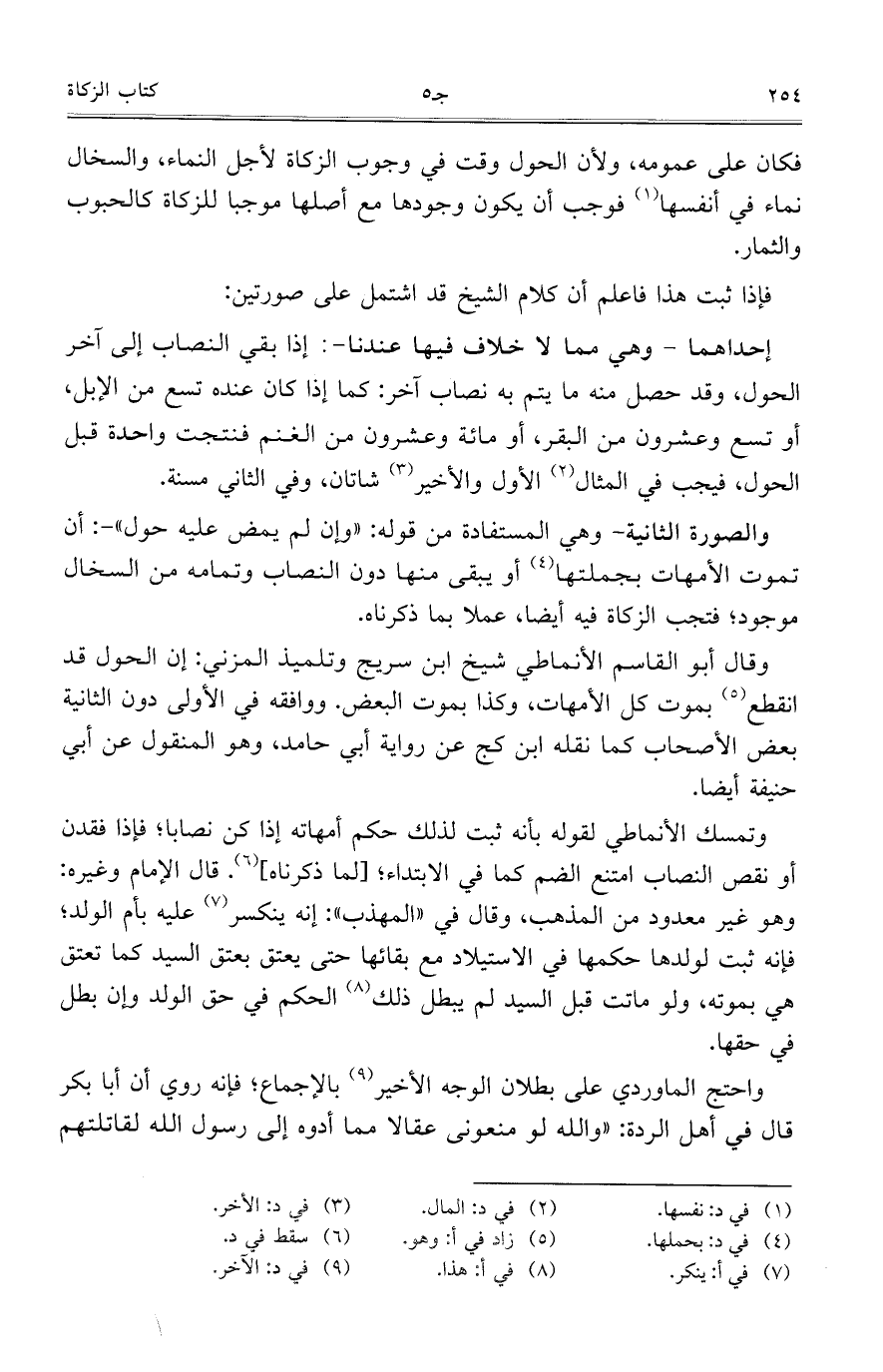 وقال أبو القاسم الأنماطي شيخ ابن سريج وتلميذ المزني: إن الحول قد انقطع بموت كل الأمهات، وكذا بموت البعض. ووافقه في الأولى دون الثانية بعض الأصحاب كما نقله ابن كج عن رواية أبي حامد، وهو المنقول عن أبي حنيفة أيضاً.