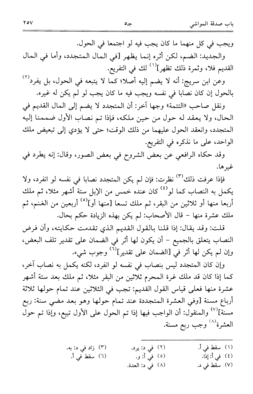 وإن كان المتجدد ليس بنصاب في نفسه لو انفرد، لكنه يكمل به نصاب آخر، كما إذا كان قد ملك غرة المحرم ثلاثين من البقر مثلاً، ثم ملك بعد ستة أشهر عشرة منها فعلى قياس القول القديم: تجب في الثلاثين عند تمام حولها ثلاثة أرباع مسنة [وفي العشرة المتجددة عند تمام حولها وهو بعد مضي سنة: ربع مسنة] والمنقول: أن الواجب فيها إذا تم الحول على الأول تبيع، وإذا تم حول العشرة وجب ربع مسنة.