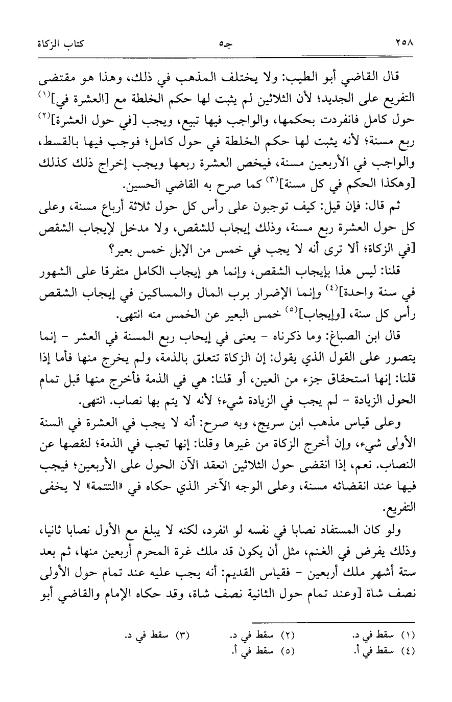 ثم قال: فإن قيل: كيف توجبون على رأس كل حول ثلاثة أرباع مسنة، وعلى كل حول العشرة ربع مسنة، وذلك إيجاب للشقص، ولا مدخل لإيجاب الشقص [في الزكاة؛ ألا ترى أنه لا يجب في خمس من الإبل خمس بعير؟