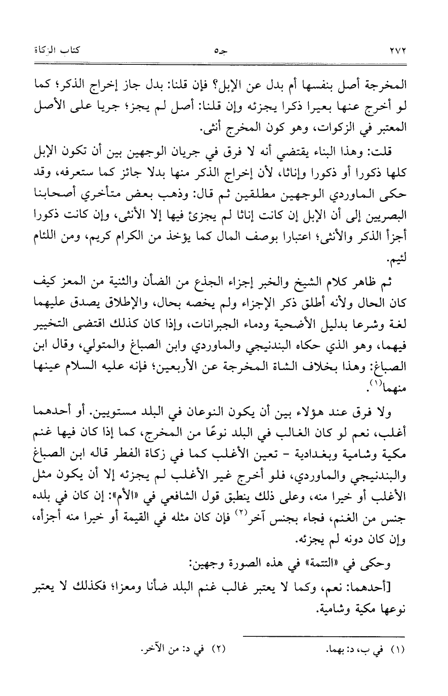 ولا فرق عند هؤلاء بين أن يكون النوعان في البلد مستويين. أو أحدهما أغلب، نعم لو كان الغالب في البلد نوعاً من المخرج، كما إذا كان فيها غنم مكية وشامية وبغدادية- تعين الأغلب كما في زكاة الفطر قاله ابن الصباغ والبندنيجي والماوردي، فلو أخرج غير الأغلب لم يجزئه إلا أن يكون مثل الأغلب أو خيراً منه، وعلى ذلك ينطبق قول الشافعي في "الأم": إن كان في بلده جنس من الغنم، فجاء بجنس آخر فإن كان مثله في القيمة أو خيراً منه أجزأه، وإن كان دونه لم يجزئه.