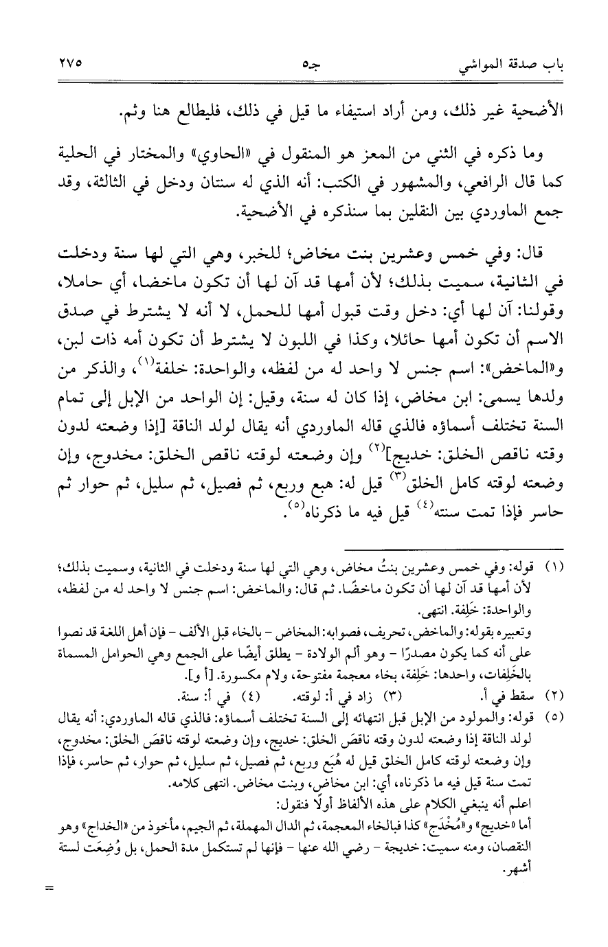 قال: وفي خمس وعشرين بنت مخاض؛ للخبر، وهي التي لها سنة ودخلت في الثانية، سميت بذلك؛ لأن أمها قد آن لها أن تكون ماخضاً، أي حاملاً، وقولنا: آن لها أي: دخل وقت قبول أمها للحمل، لا أنه لا يشترط في صدق الاسم أن تكون أمها حائلاً، وكذا في اللبون لا يشترط أن تكون أمه ذات لبن، و"الماخض": اسم جنس لا واحد له من لفظه، والواحدة: خلفة، والذكر من ولدها يسمى: ابن مخاض، إذا كان له سنة، وقيل: إن الواحد من الإبل إلى تمام السنة تختلف أسماؤه فالذي قاله الماوردي أنه يقال لولد الناقة [إذا وضعته لدون وقته ناقص الخلق: خديج] وإن وضعته لوقته ناقص الخلق: مخدوج، وإن وضعته لوقته كامل الخلق قيل له: هبع وربع، ثم فصيل، ثم سليل، ثم حوار ثم حاسر فإذا تمت سنته قيل فيه ما ذكرناه.
