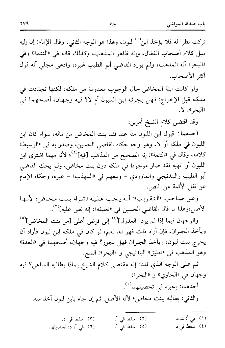 تركت نظراً له فلا يؤخذ ابن لبون، وهذا هو الوجه الثاني، وقال الإمام: إن إليه ميل كلام أصحاب القفال، وإنه ظاهر المذهب، وكذلك قاله في "التتمة" وفي "البحر" أنه المذهب، ولم يورد القاضي أبو الطيب غيره، وادعى مجلي أنه قول أكثر الأصحاب.