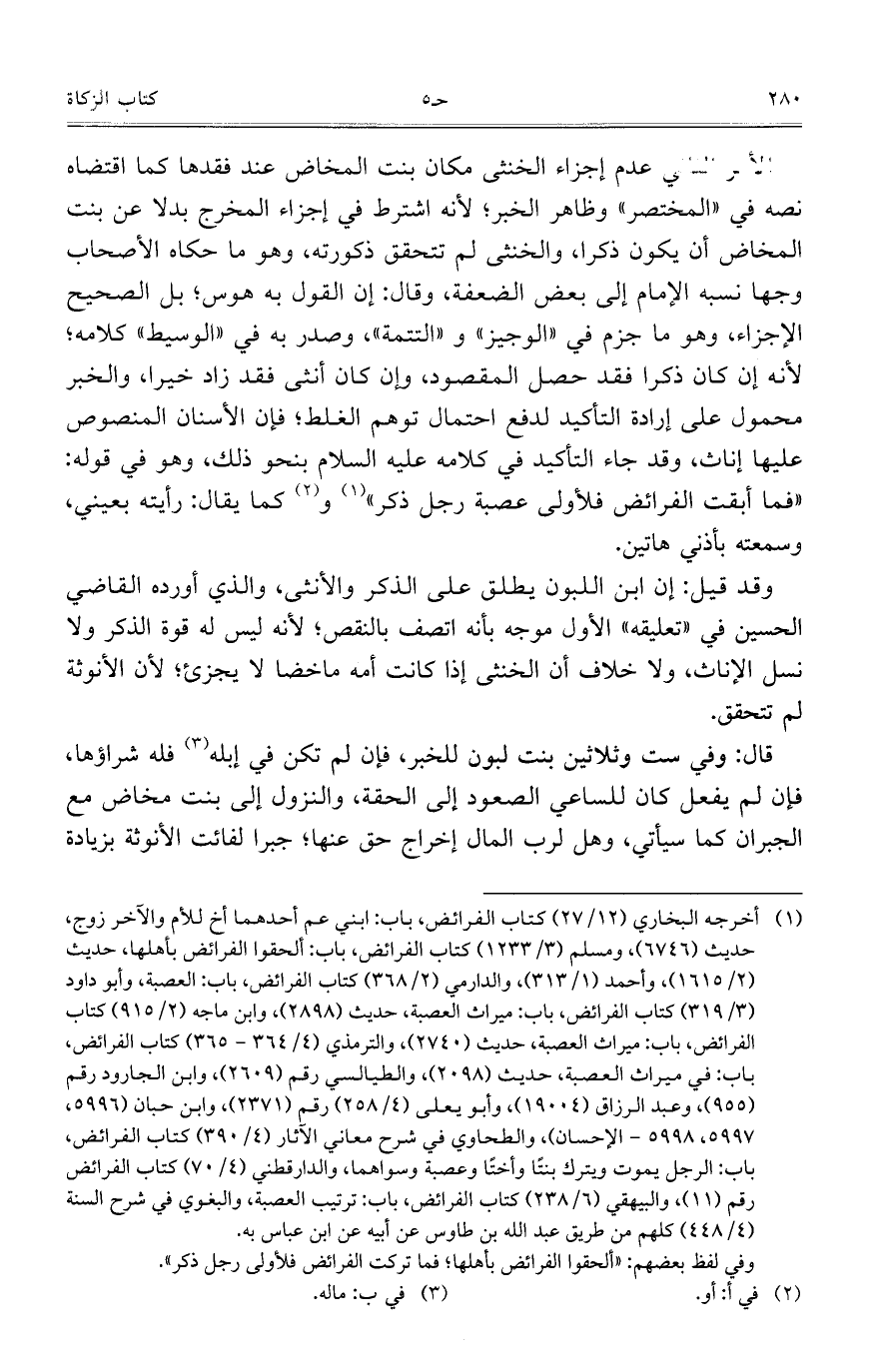 الأمر الثاني عدم إجزاء الخنثى مكان بنت المخاض عند فقدها كما اقتضاه نصه في "المختصر" وظاهر الخبر؛ لأنه اشترط في إجزاء المخرج بدلاً عن بنت المخاض أن يكون ذكراً، والخنثى لم تتحقق ذكورته، وهو ما حكاه الأصحاب وجهاً نسبه الإمام إلى بعض الضعفة، وقال: إن القول به هوس؛ بل الصحيح الإجزاء، وهو ما جزم في "الوجيز" و"التتمة"، وصدر به في "الوسيط" كلامه؛ لأنه إن كان ذكراً فقد حصل المقصود، وإن كان أنثى فقد زاد خيراً، والخبر محمول على إرادة التأكيد لدفع احتمال توهم الغلط؛ فإن الأسنان المنصوص عليها إناث، وقد جاء التأكيد في كلامه عليه السلام بنحو ذلك، وهو في قوله: "فما أبقت الفرائض فلأولى عصبة رجل ذكر" وكما يقال: رأيته بعيني، وسمعته بأذني هاتين.