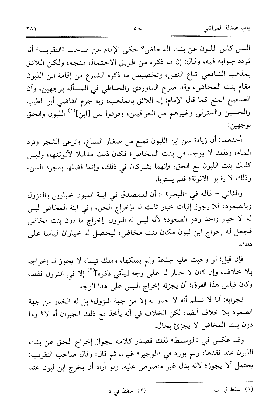 السن كابن اللبون عن بنت المخاض؟ حكى الإمام عن صاحب "التقريب" أنه تردد جوابه فيه، وقال: إن ما ذكره من طريق الاحتمال متجه، ولكن اللائق بمذهب الشافعي اتباع النص، وتخصيص ما ذكره الشارع من إقامة ابن اللبون مقام بنت المخاض، وقد صرح الماوردي والحناطي في المسألة بوجهين، وأن الصحيح المنع كما قال الإمام: إنه اللائق بالمذهب، وبه جزم القاضي أبو الطيب والحسين والمتولي وغيرهم من العراقيين، وفرقوا بين [ابن] اللبون والحق بوجهين: