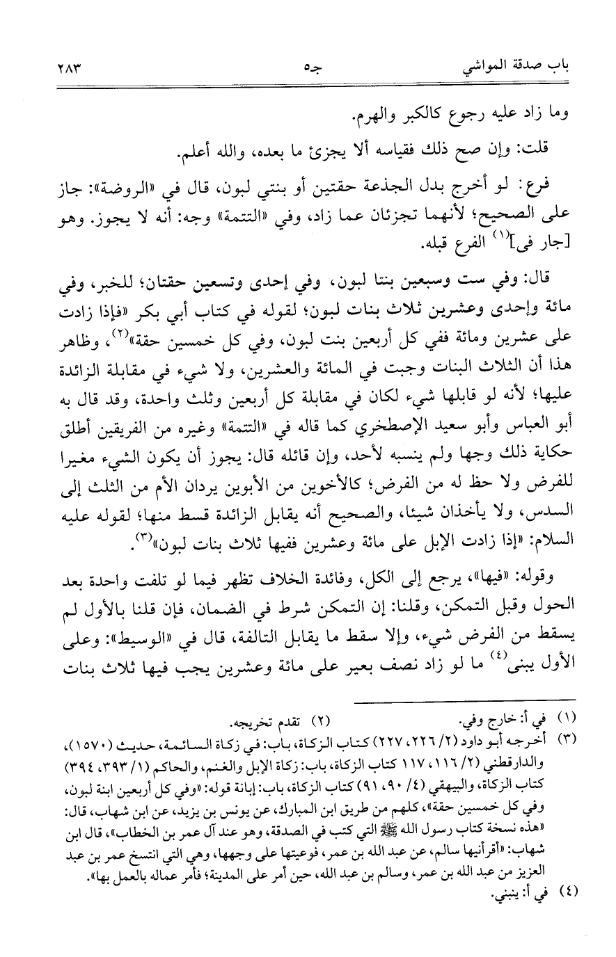 قال: وفي ست وسبعين بنتا لبون، وفي إحدى وتسعين حقتان؛ للخبر، وفي مائة وإحدى وعشرين ثلاث بنات لبون، لقوله في كتاب أبي بكر "فإذا زادت على عشرين ومائة ففي كل أربعين بنت لبون، وفي كل خمسين حقة"، وظاهر هذا أن الثلاث البنات وجبت في المائة والعشرين، ولا شيء في مقابلة الزائدة عليها؛ لأنه لو قابلها شيء لكان في مقابلة كل أربعين وثلث واحدة، وقد قال به أبو العباس وأبو سعيد الإصطخري كما قاله في "التتمة" وغيره من الفريقين أطلق حكاية ذلك وجهاً ولم ينسبه لأحد، وإن قائله قال: يجوز أن يكون الشيء مغيراً للفرض ولاحظ له من الفرض؛ كالأخوين من الأبوين يردان الأم من الثلث إلى السدس، ولا يأخذان شيئاً، والصحيح أنه يقابل الزائدة قسط منها؛ لقوله عليه السلام: "إذا زادت الإبل على مائة وعشرين ففيها ثلاث بنات لبون".