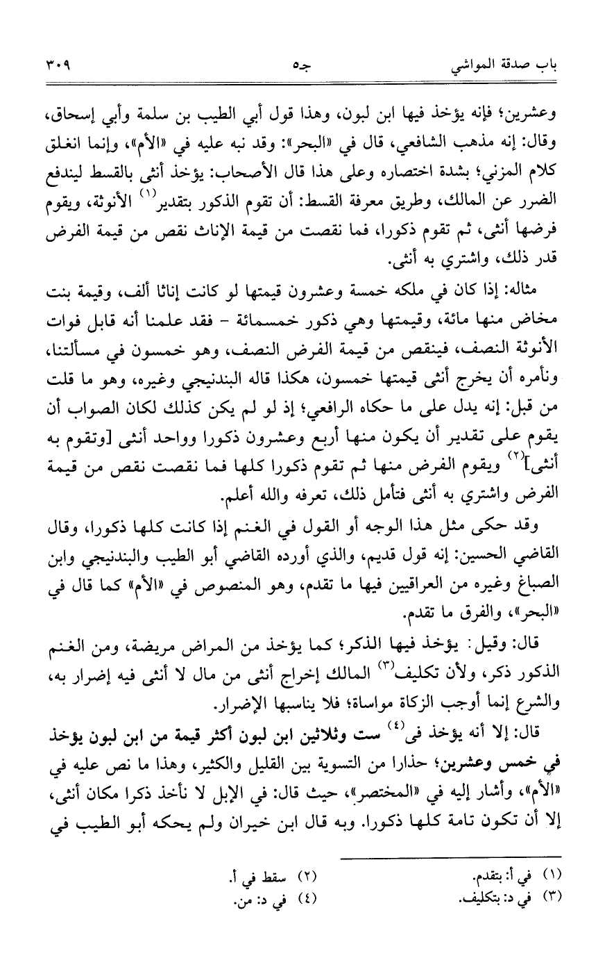 مثاله: إذا كان في ملكه خمسة وعشرون قيمتها لو كانت إناثاً ألف، وقيمة بنت مخاض منها مائة، وقيمتها وهي ذكور خمسمائة- فقد علمنا أنه قابل فوات الأنوثة النصف، فينقص من قيمة الفرض النصف، وهو خمسون في مسألتنا، ونأمره أن يخرج أنثى قيمتها خمسون، هكذا قاله البندنيجي وغيره، وهو ما قلت من قبل: إنه يدل على ما حكاه الرافعي؛ إذ لو لم يكن كذلك لكان الصواب أن يقوم على تقدير أن يكون منها أربع وعشرون ذكوراً وواحد أنثى [وتقوم به أنثى] ويقوم الفرض منها ثم تقوم ذكوراً كلها فما نقصت نقص من قيمة الفرض واشتري به أنثى فتأمل ذلك، تعرفه والله أعلم.