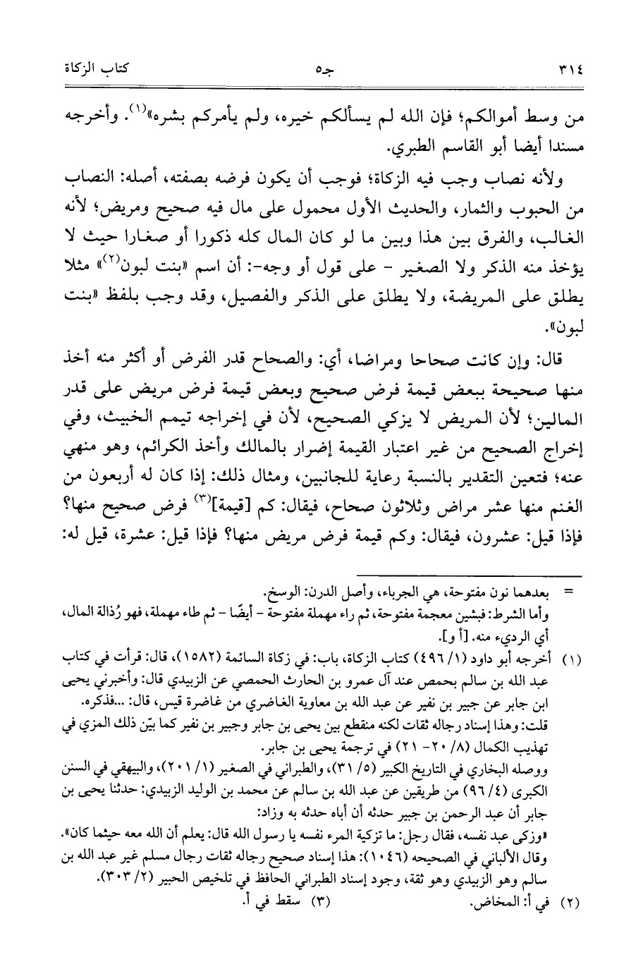 ولأنه نصاب وجب فيه الزكاة؛ فوجب أن يكون فرضه بصفته، أصله: النصاب من الحبوب والثمار، والحديث الأول محمول على مال فيه صحيح ومريض؛ لأنه الغالب، والفرق بين هذا وبين ما لو كان المال كله ذكوراً أو صغاراً حيث لا يؤخذ منه الذكر ولا الصغير- على قول أو وجه: أن اسم "بنت لبون" مثلاً يطلق على المريضة، ولا يطلق على الذكر والفصيل، وقد وجب بلفظ "بنت لبون".