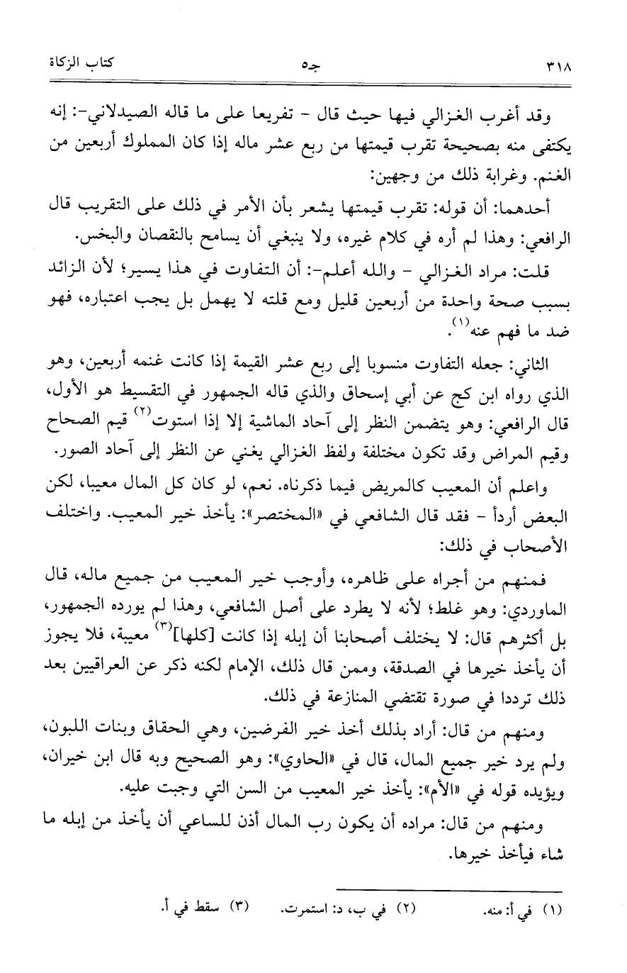وقد أغرب الغزالي فيها حيث قال- تفريعاً على ما قاله الصيدلاني-: إنه يكتفي منه بصحيحة تقرب قيمتها من ربع عشر ماله إذا كان المملوك أربعين من الغنم. وغرابة ذلك من وجهين: