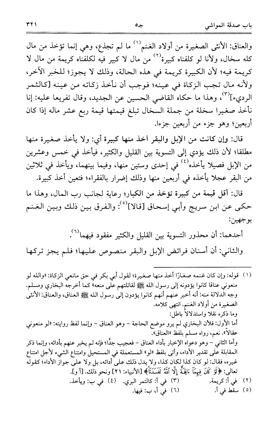 قال: وإن كانت من الإبل والبقر أخذ منها كبيرة أي: ولا يأخذ صغيرة منها مطلقاً؛ لأن ذلك يؤدي إلى التسوية بين القليل والكثير، فيأخذ في خمس وعشرين من الإبل فصيلاً يأخذه في إحدى وستين منها، وفيما بينهما، ويأخذ في ثلاثين من البقر عجلاً يأخذه في أربعين منها وذلك إضرار بالفقراء؛ فتعين أخذ كبيرة.