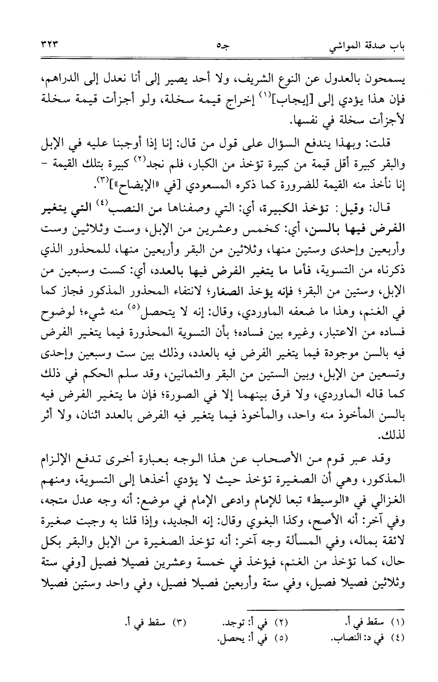 قلت: وبهذا يندفع السؤال على قول من قال: إنا إذا أوجبنا عليه في الإبل والبقر كبيرة أقل قيمة من كبيرة تؤخذ من الكبار، فلم نجد كبيرة بتلك القيمة- إنا نأخذ منه القيمة للضرورة كما ذكره المسعودي [في "الإيضاح"].