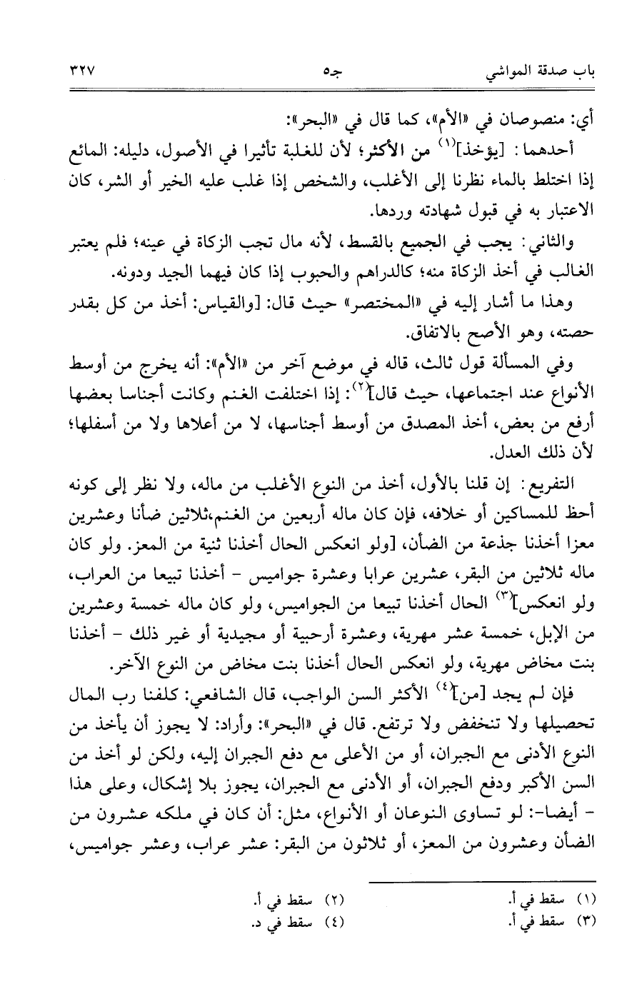 فإن لم يجد [من] الأكثر السن الواجب، قال الشافعي: كلفنا رب المال تحصيلها ولا تنخفض ولا ترتفع. قال في "البحر": وأراد: لا يجوز أن يأخذ من النوع الأدنى مع الجبران، أو من الأعلى مع دفع الجبران إليه، ولكن لو أخذ من السن الأكبر ودفع الجبران، أو الأدنى مع الجبران، يجوز بلا إشكال، وعلى هذا – أيضاً-: لو تساوى النوعان أو الأنواع، مثل: أن كان في ملكه عشرون من الضأن وعشرون من المعز، أو ثلاثون من البقر: عشر عراب، وعشر جواميس،