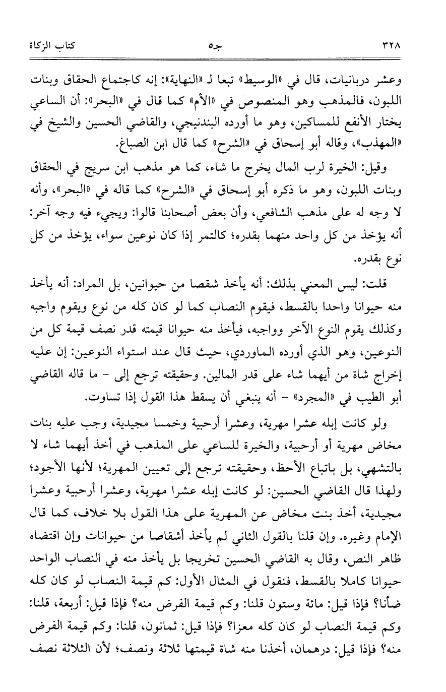 وقيل: الخيرة لرب المال يخرج ما شاء، كما هو مذهب ابن سريج في الحقاق وبنات اللبون، وهو ما ذكره أبو إسحاق في "الشرح" كما قاله في "البحر" وأنه لا وجه له على مذهب الشافعي، وأن بعض أصحابنا قالوا: ويجيء فيه وجه آخر: أنه يؤخذ من كل واحد منهما بقدره؛ كالتمر إذا كان نوعين سواء، يؤخذ من كل نوع بقدره.