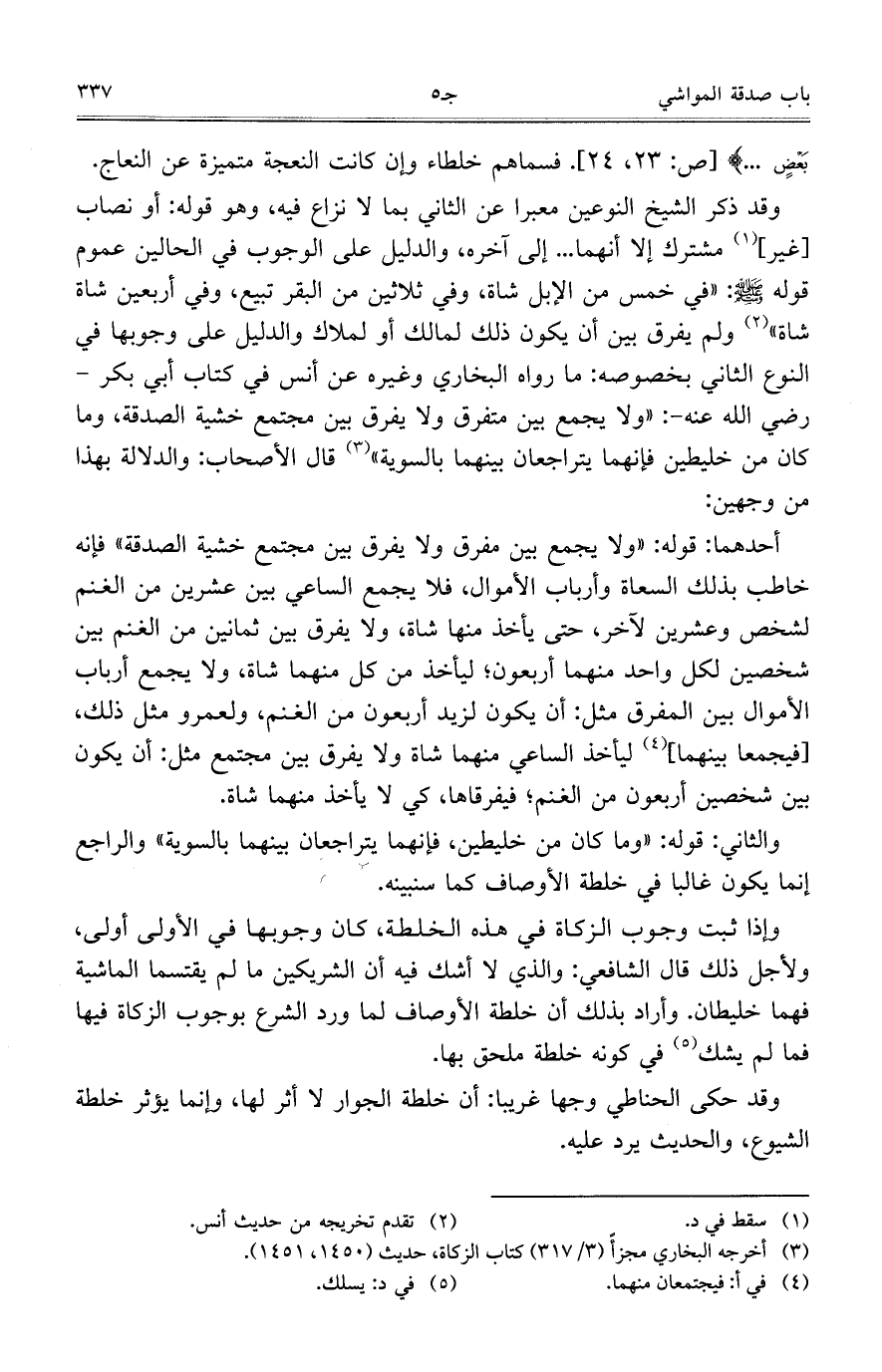 وقد ذكر الشيخ النوعين معبراً عن الثلاني بما لا نزاع فيه، وهو قوله: أو نصاب [غير] مشترك إلا أنهما .. إلى آخره، والدليل على الوجوب في الحالين عموم قوله - صلى الله عليه وسلم -: "في خمس من الإبل شاة، وفي ثلاثين من البقر تبيع، وفي أربعين شاة شاة" ولم يفرق بين أن يكون ذلك لمالك أو لملاك والدليل على وجوبها في النوع الثاني بخصوصه: ما رواه البخاري وغيره عن أنس في كتاب أبي بكر- رضي الله عنه-: "ولا يجمع بين متفرق ولا يفرق بين مجتمع خشية الصدقة، وما كان من خليطين فإنهما يتراجعان بينهما بالسوية" قال الأصحاب: والدلالة بهذا من وجهين: