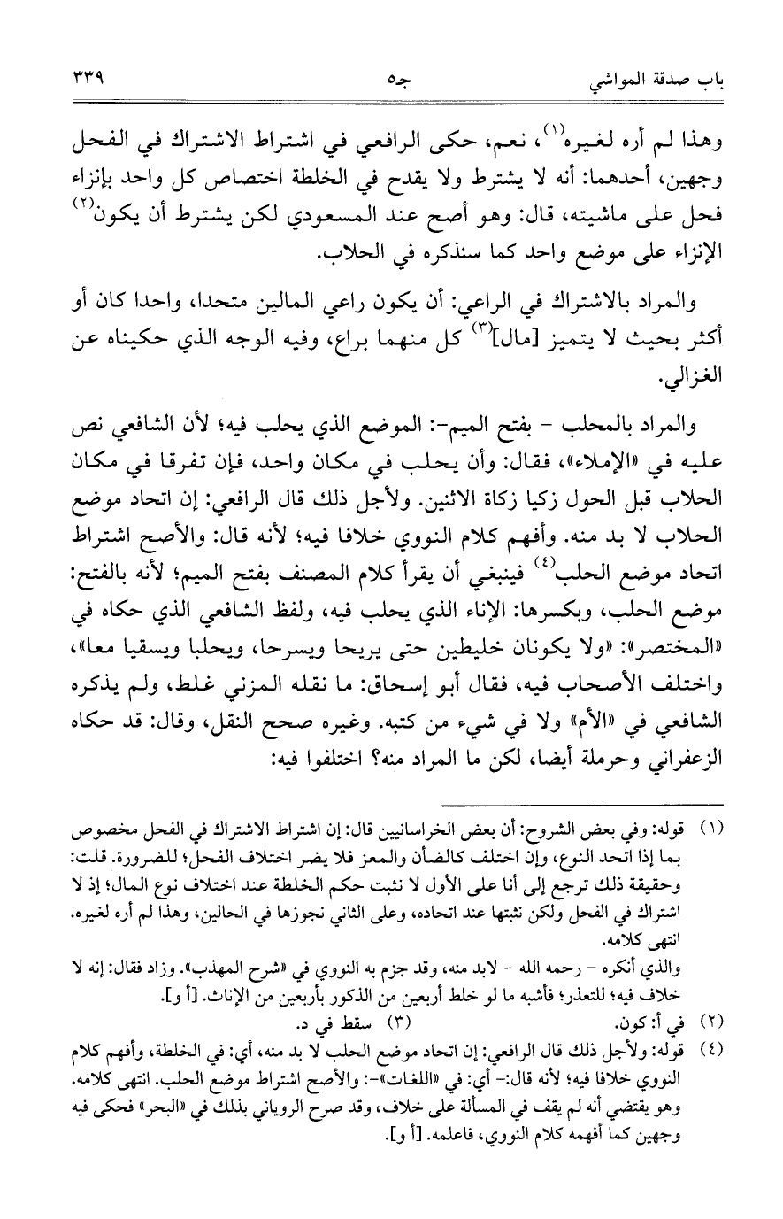 والمراد بالاشتراك في الراعي: أن يكون راعي المالين متحداً، واحداً كان أو أكثر بحيث لا يتميز [مال] كل منهما براع، وفيه الوجه الذي حكيناه عن الغزالي.