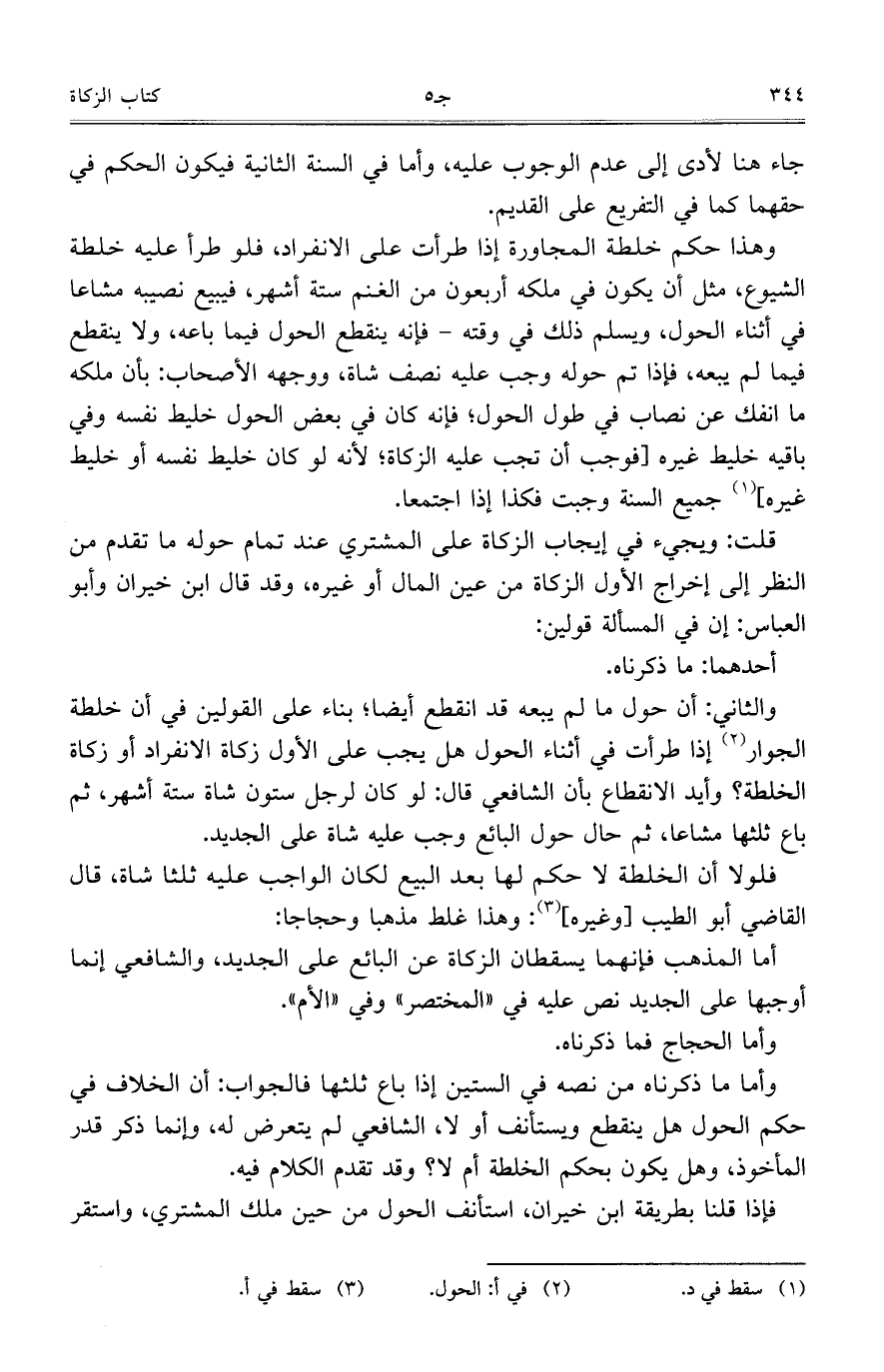 والثاني: أن حول ما لم يبعه قد انقطع أيضاً؛ بناء على القولين في أن خلطة الجوار إذا طرأت في أثناء الحول هل يجب على الأول زكاة الانفراد أو زكاة الخلطة؟ وأيد الانقطاع بأن الشافعي قال: لو كان لرجل ستون شاة ستة أشهر، ثم باع ثلثها مشاعاً، ثم حال حول البائع وجب عليه شاة على الجديد.
