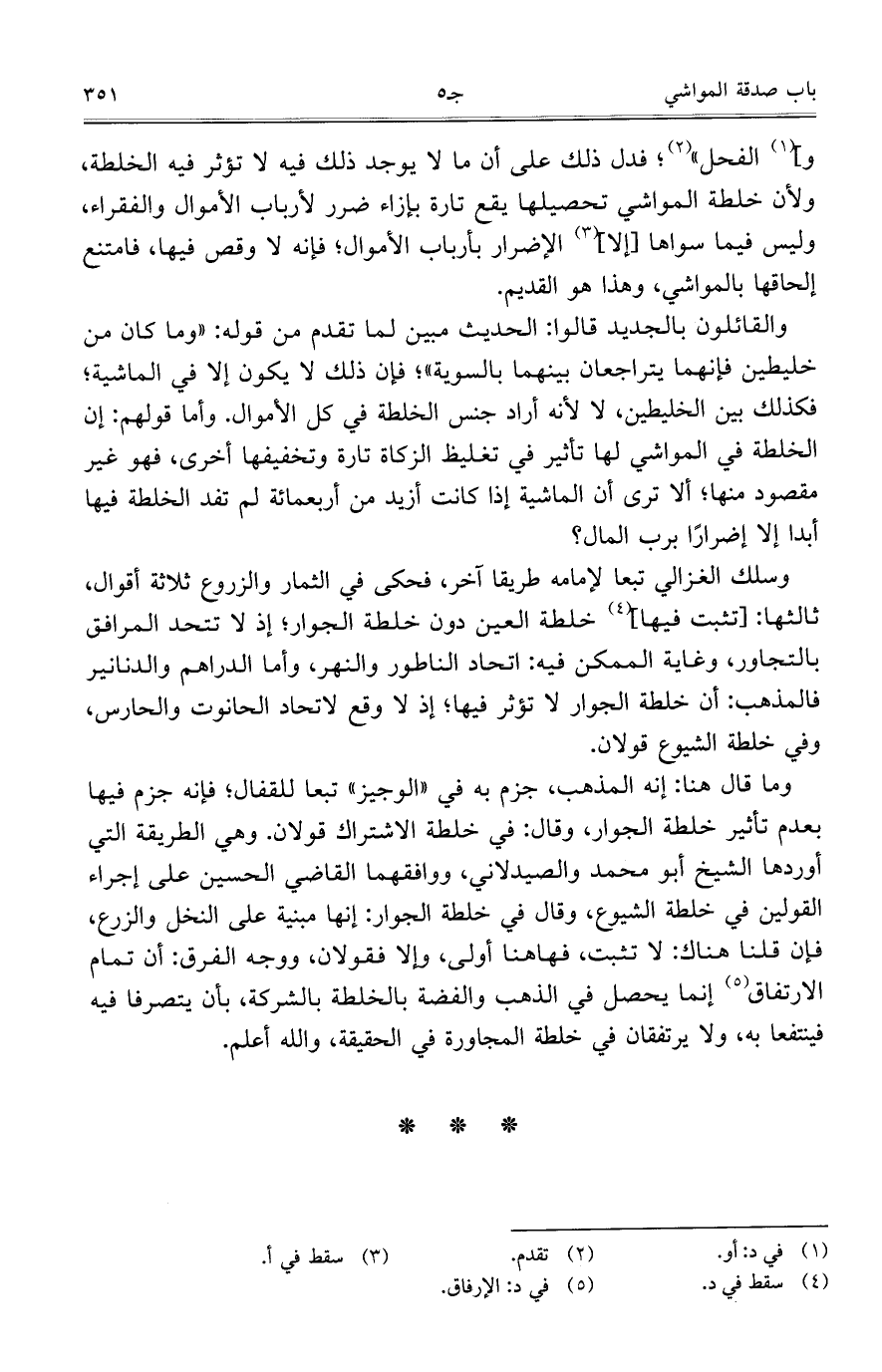 والقائلون بالجديد قالوا: الحديث مبين لما تقدم من قوله: "وما كان من خليطين فإنهما يتراجعان بينهما بالسوية"؛ فإن ذلك لا يكون إلا في الماشية؛ فكذلك بين الخليطين، لا لأنه أراد جنس الخلطة في كل الأموال. وأما قولهم: إن الخلطة في المواشي لها تأثير في تغليظ الزكاة تارة وتخفيفها أخرى، فهو غير مقصود منها؛ ألا ترى أن الماشية إذا كانت أزيد من أربعمائة لم تفد الخلطة فيها أبداً إلا إضراراً برب المال؟