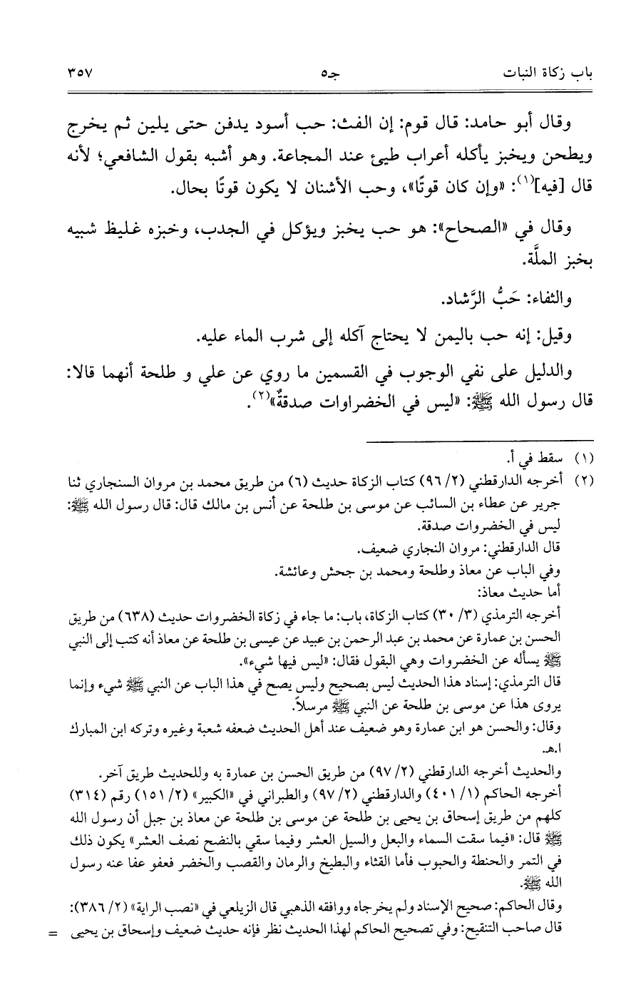 والدليل على نفي الوجوب في القسمين ما روي عن علي وطلحة أنهما قالا: قال رسول الله - صلى الله عليه وسلم -: "ليس في الخضراوات صدقةُ".