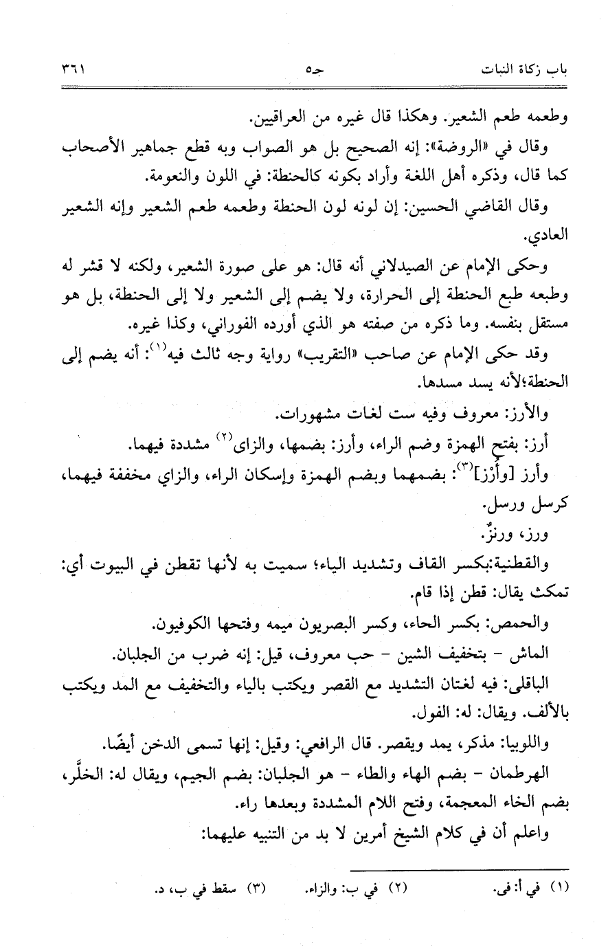وحكى الإمام عن الصيدلاني أنه قال: هو على صورة الشعير، ولكنه لا قشر له وطبعه طبع الحنطة إلى الحرارة، ولا يضم إلى الشعير ولا إلى الحنطة، بل هو مستقل بنفسه. وما ذكره من صفته هو الذي أورده الفوراني، وكذا غيره.