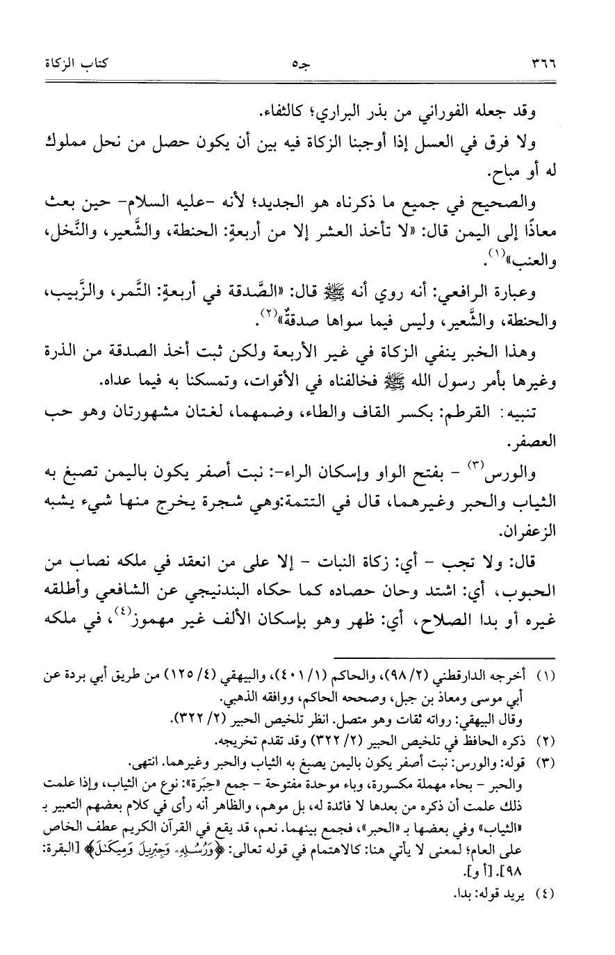 وعبارة الرافعي: أنه روي أنه - صلى الله عليه وسلم - قال: "الصَّدقة في أربعةٍ: التَّمر، والزَّبيب، والحنطة، والشَّعير، وليس فيما سواها صدقةُ".
