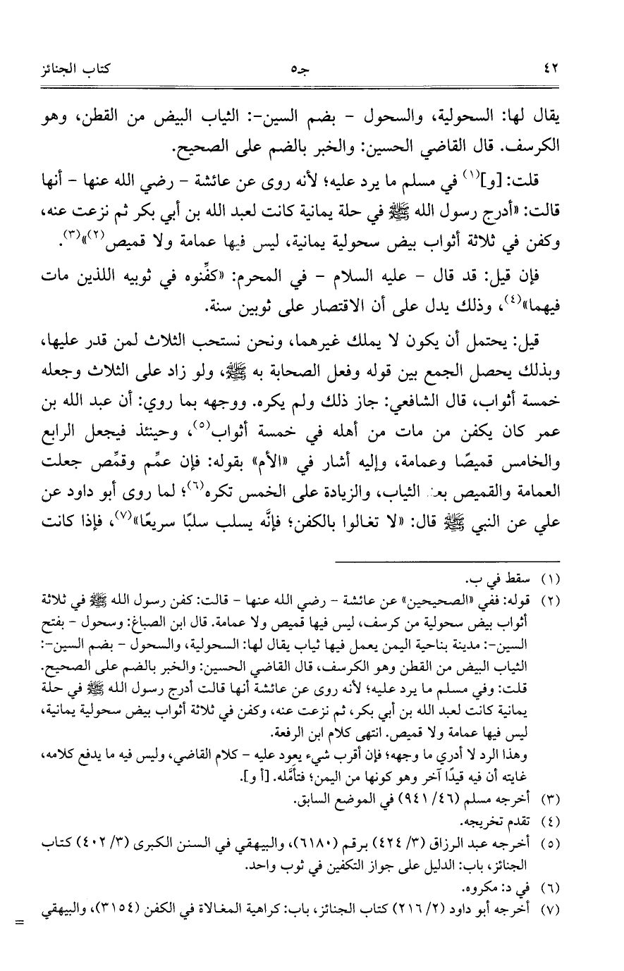 قلت: [و] في مسلم ما يرد عليه؛ لأنه روى عن عائشة- رضري الله عنها- أنها قالت: "أدرج رسول الله - صلى الله عليه وسلم - في حلة يمانية كانت لعبد الله بن أبي بكر ثم نزعت عنه، وكفن في ثلاثة أثواب بيض سحولية يمانية، ليس فيها عمامة ولا قميص".